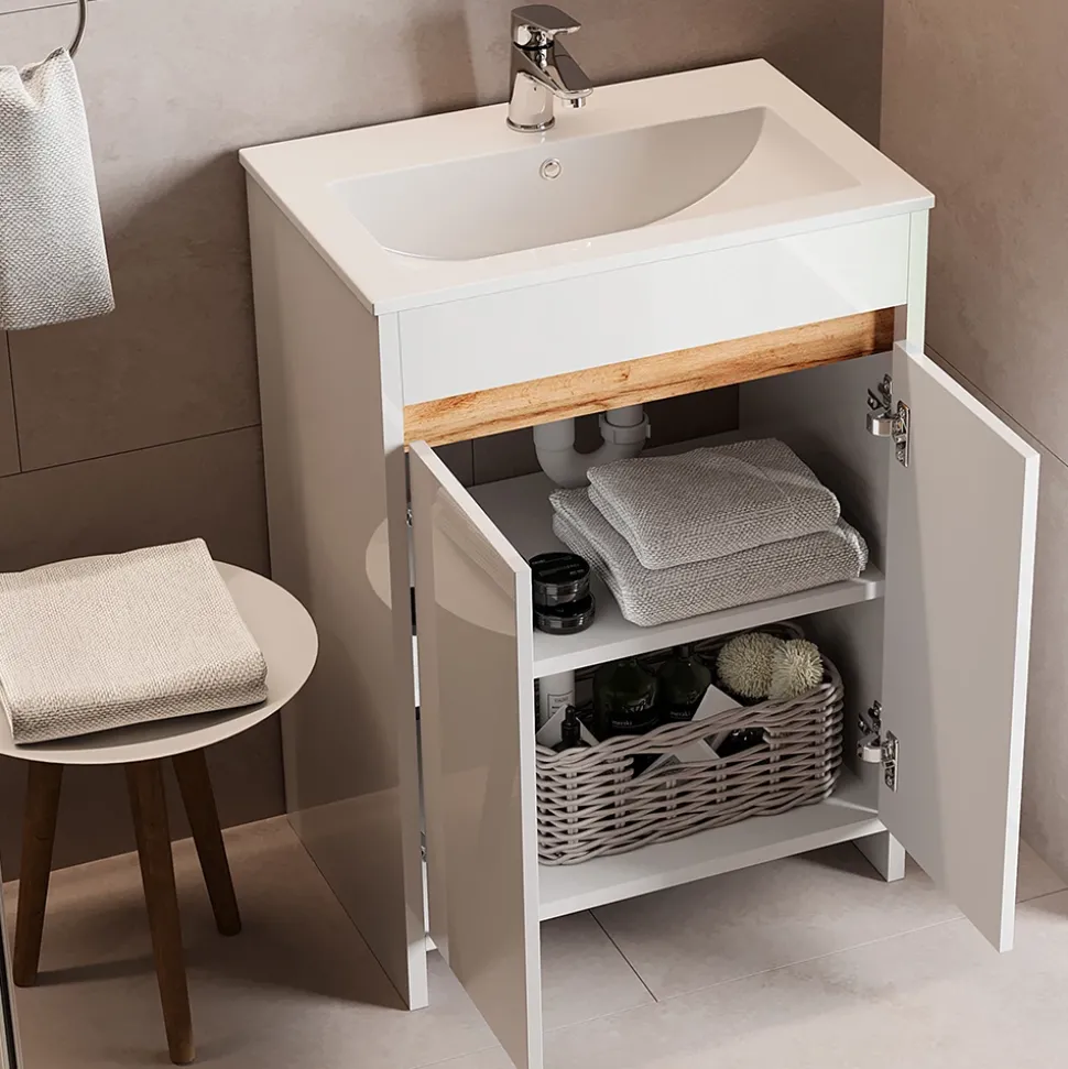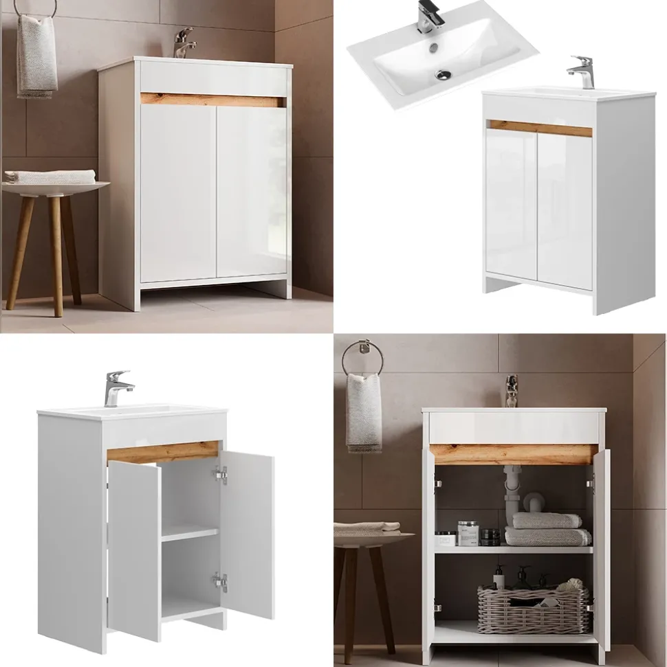 - Das Badezimmerschrank-Set verfügt über 2 Türen und Soft-Close Scharniere für leises Schließen. Ein Waschbecken ist ebenfalls im Set enthalten.