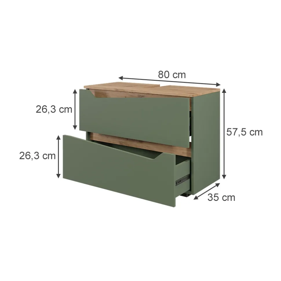 - MAßE: Der Unterschrank für das Badezimmer hat eine Tiefe von 35 cm, eine Breite von 80 cm und eine Höhe von 57,5 cm. Die detaillierten Größen sind auf den Fotos ersichtlich.