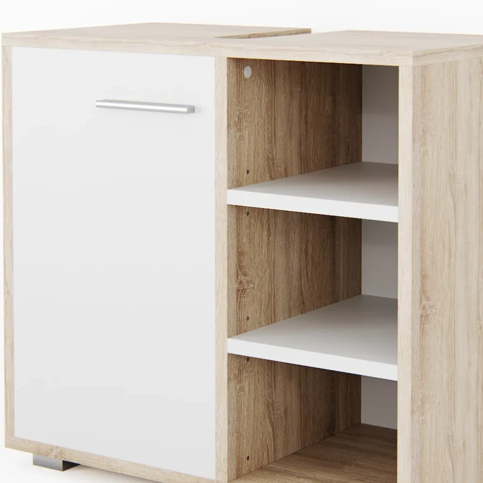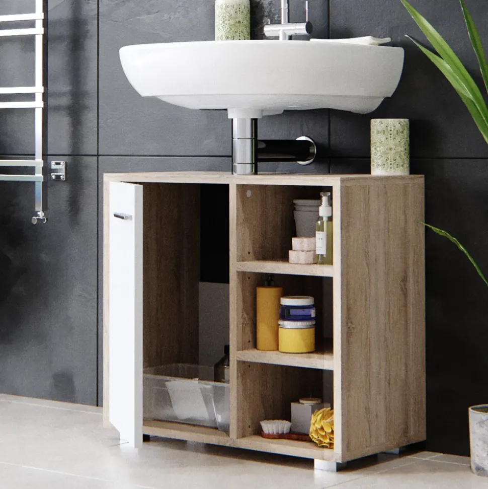 Der Waschbeckenunterschrank Perry ist ein kompakter und stilvoller Badunterschrank, der perfekt für kleinere Badezimmer geeignet ist. Er bietet ausreichend Stauraum für alle wichtigen Badezimmerutensilien und verfügt über eine Aussparung für einen Siphon. Die Flügeltür und die 3 offenen Ablageflächen sorgen für eine optimale Organisation und einfachen Zugriff auf alles, was Sie brauchen. Dieses Badmöbel ist Teil der Perry Kollektion und kann problemlos mit anderen Artikeln derselben Kollektion kombiniert werden.
