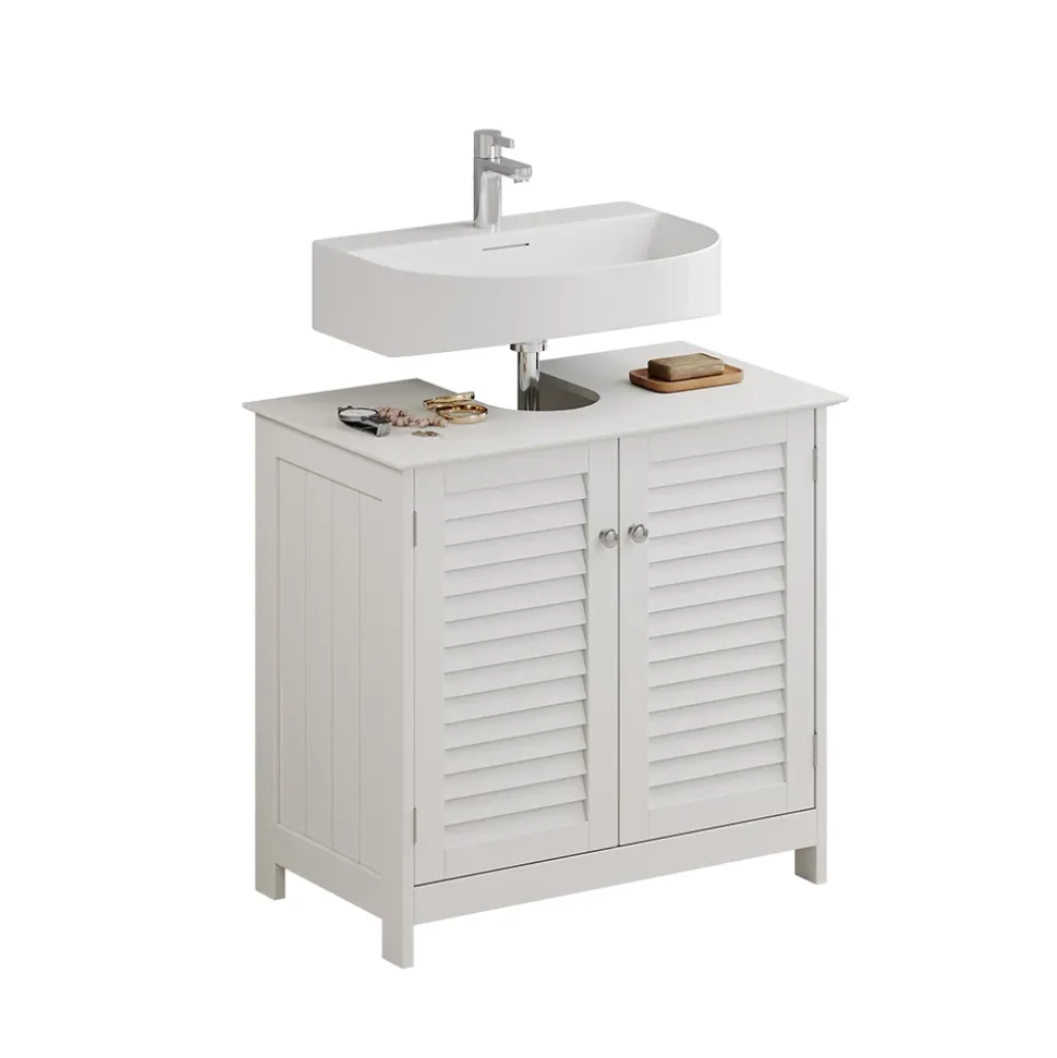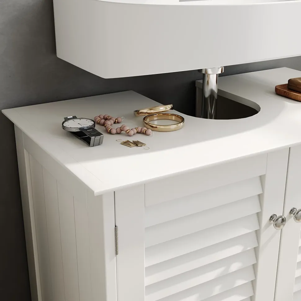 - Erleben Sie den Vicco Waschtischunterschrank Riad in Weiß. 2 clevere Türen sorgen für eine geordnete Badezimmeraufbewahrung. Perfekt für Ihr Waschbecken samt Kosmetikbedarf.