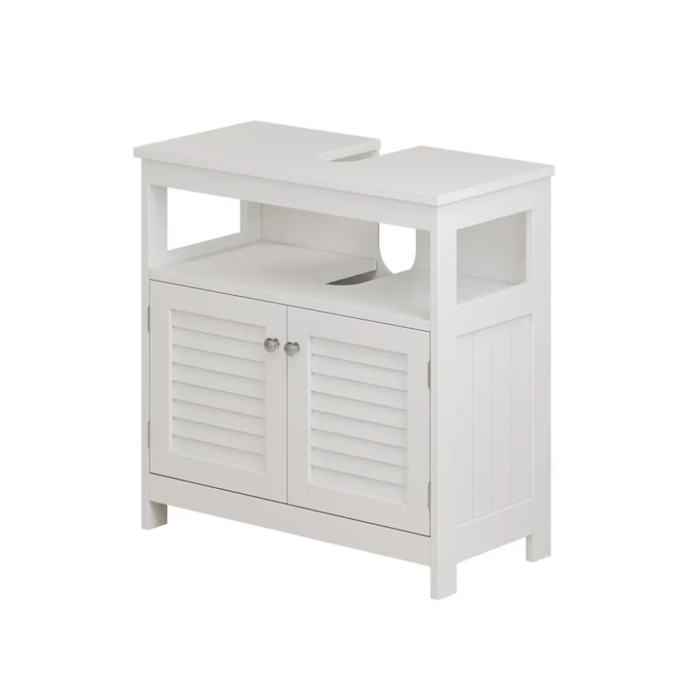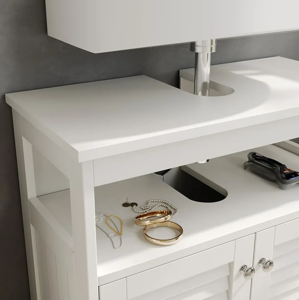 - Erleben Sie den Vicco Waschtischunterschrank Riad: in Weiß mit 2 Türen und Zwischenablage – perfekte Badezimmeraufbewahrung für Waschbecken und mehr.