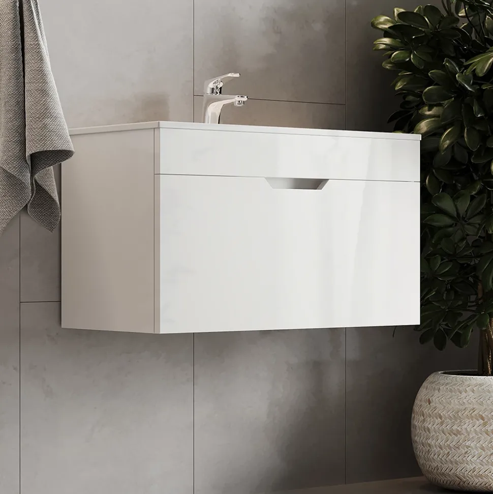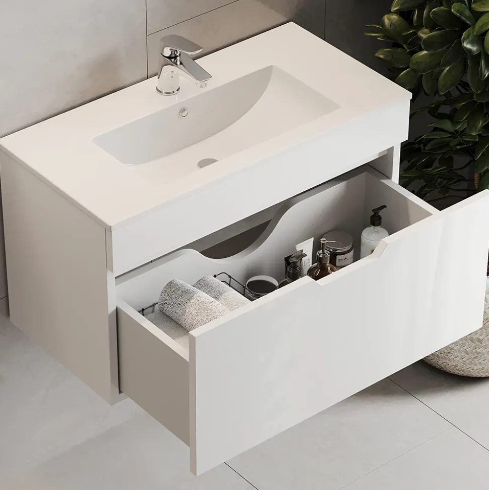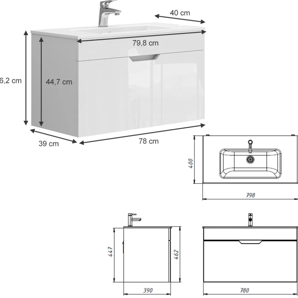 Die Schublade des Waschtischunterschranks ist mit einem hochwertigen „Häfele“-Soft-Close-Scharnier, für sanftes Öffnen und Schließen, ausgestattet. Die edle Hochglanzfront verleiht dem Badschrank eine elegante und moderne Optik. Das Waschbecken ist bereits im Lieferumfang enthalten, sodass Sie alles für Ihren Waschplatz komplett haben. Die pflegeleichte Oberfläche ermöglicht eine einfache Reinigung und langanhaltende Schönheit.