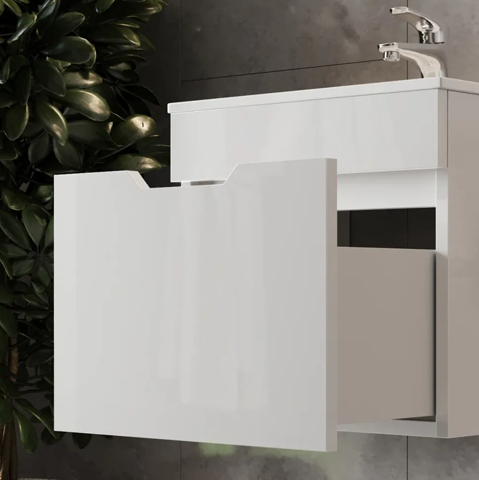 - Das Set mit Waschbeckenunterschrank bietet viel Stauraum und wird an der Wand montiert. Es enthält ein Waschbecken und ist eine praktische Lösung für das Bad.