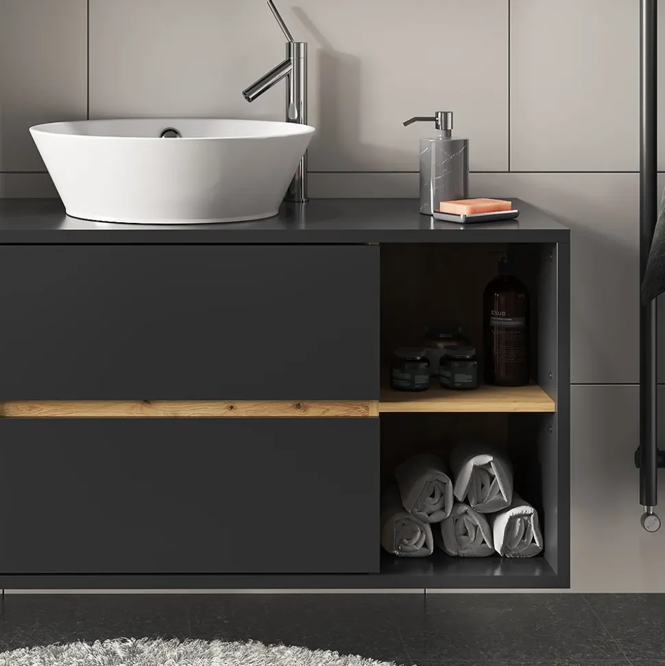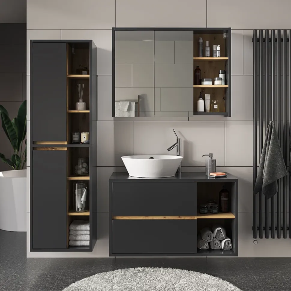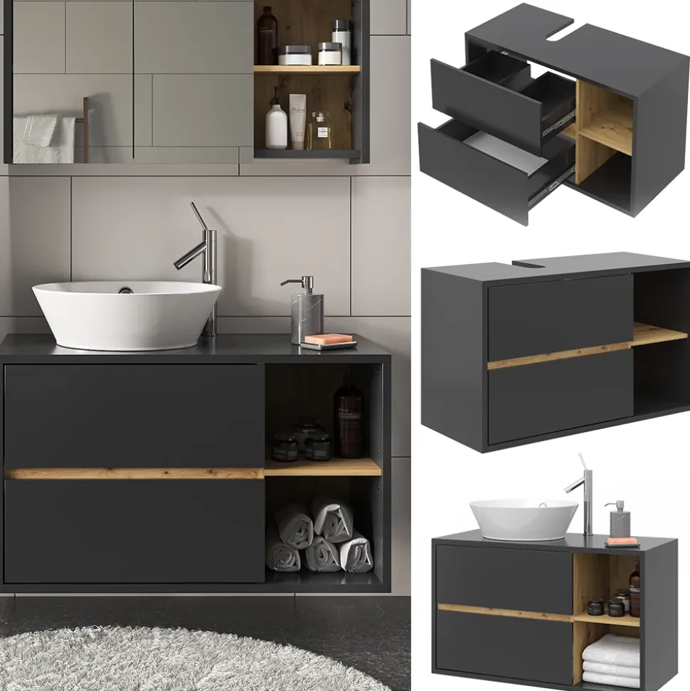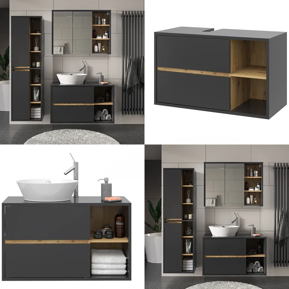 Unsere Badmöbelserie gibt es in vier unterschiedlichen Farbvarianten. Hoch modern und funktional kann man zwischen dem edlen Artisan mit Anthrazit-Holz-Look, Weiß matt mit Anthrazit-Look, Anthrazit mit Artisan-Look oder Grau mit Anthrazit-Look wählen. Diese Design-Highlights werden sich hervorragend in jedes Bad einfügen und machen es zu einem Hingucker in jedem Zuhause.