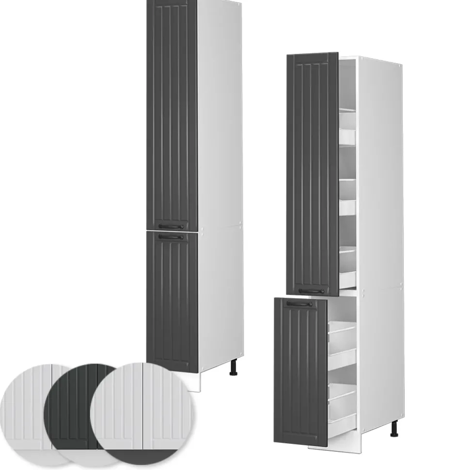 - MAßE: Der Küchenschrank hoch hat folgende Abmessungen: Breite: 30 cm, Höhe: 206,8 cm, Tiefe: 58 cm. Alle detaillierten Größen sind auf den Fotos angegeben.