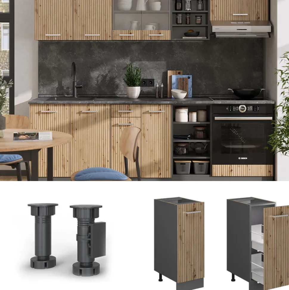 Der Apothekerschrank R-Line mit Arbeitsplatte ist die perfekte Lösung für alle, die mehr Organisation und Stauraum in ihrer Küche benötigen. Er kann als Küchenunterschrank, Medizinschrank oder Unterschrank in der Küche genutzt werden und ist in verschiedenen Konfigurationen erhältlich. Durch seine höhenverstellbaren Füße passt er sich jeder Raumhöhe an und ist somit in jeder Küche einsetzbar. Die modular aufgebaute Serie lässt sich nach Belieben umstellen und mit zusätzlichen Modulen erweitern. Der R-Line Apothekerschrank ist die Komplettlösung für Ihre Küche und bietet viel Platz für Ihre Küchenutensilien, Vorräte und Medikamente. Die Nutzung dieses Schrankes ermöglicht es Ihnen, alle wichtigen Dinge an einem Ort und griffbereit zu haben. Investieren Sie in den Apothekerschrank R-Line und Sie werden schnell feststellen, wie viel einfacher und effektiver Ihre Küchenarbeit wird.
