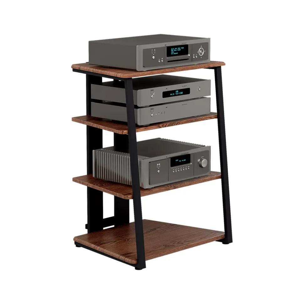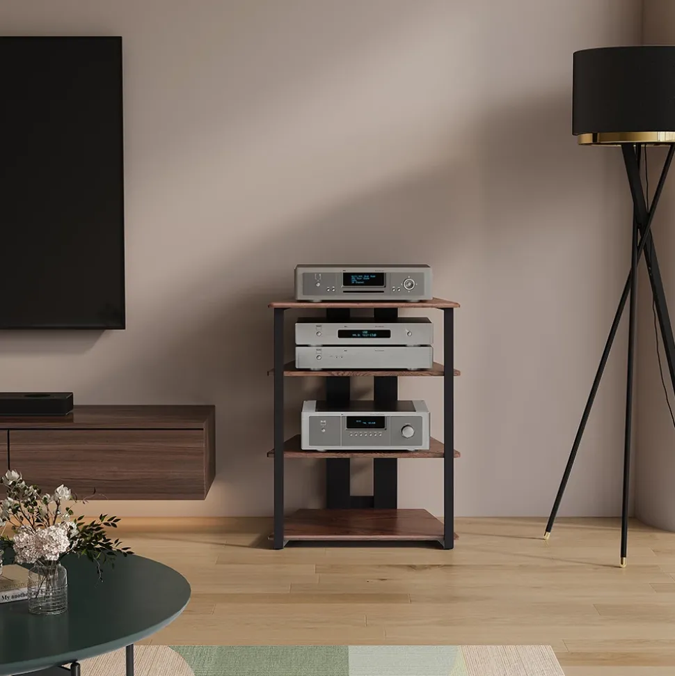 Das HiFi‑Regal „Tonar” kombiniert eine robuste Holz‑Metall‑Konstruktion mit effektiver Vibrationsentkopplung, sodass auch hochwertige Verstärker und Plattenspieler stabil und resonanzarm gelagert werden.