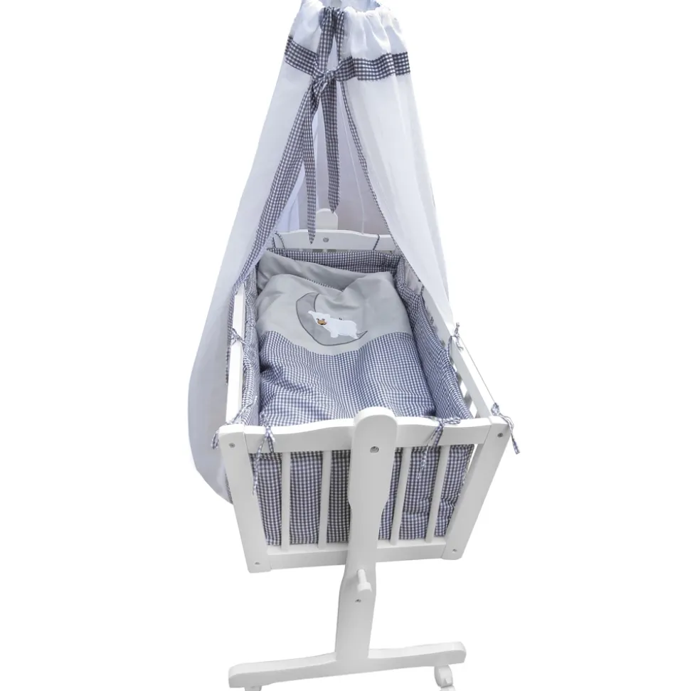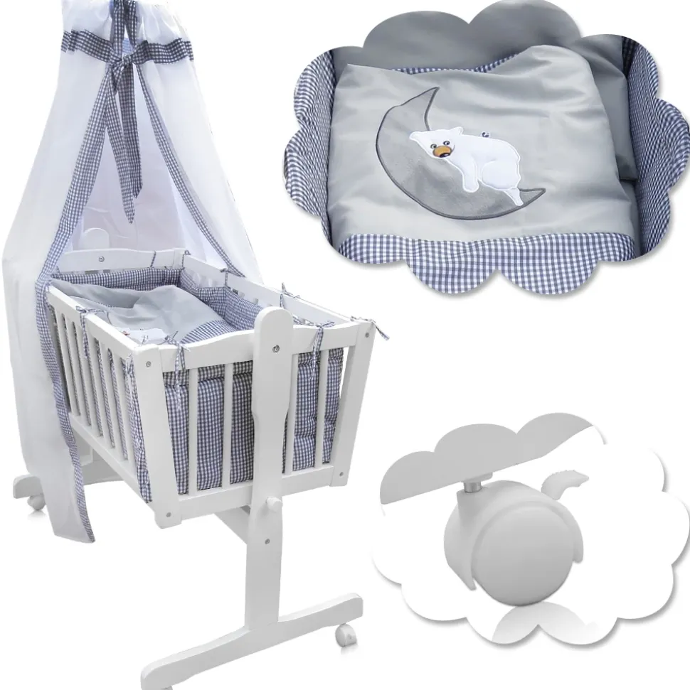 Das Babybett vereint die wichtigsten Eigenschaften, die ein Kinderbett haben sollte. Es ist ein Stubenbett, ein Gitterbett und ein Bett für Baby in einem. Der Rausfallschutz sorgt dafür, dass Ihr kleiner Schatz sicher und geborgen schlafen kann. Das Besondere an diesem Babybett ist jedoch der interessante Schaukelmechanismus, der das Einschlafen erleichtert und Ihrem Baby ein Gefühl von Geborgenheit gibt. Die Rollen an den Beinen ermöglichen es Ihnen, das Bett bequem von einem Raum in den anderen zu bewegen. Die angenehme weiße Oberfläche verleiht diesem Babybett ein zeitloses und elegantes Aussehen. Der Baldachin schützt den Schlaf Ihres Babys vor äußeren Reizen und verleiht dem Bett eine romantische Note. Mit dem Babybett schenken Sie Ihrem Baby einen gemütlichen und sicheren Schlafplatz, der zugleich eine tolle Ergänzung für Ihr Zuhause darstellt.