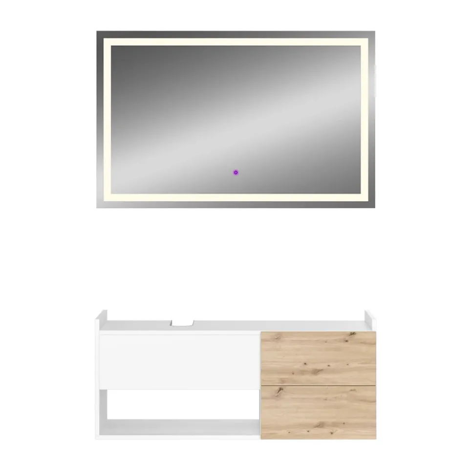 - PRODUKTMAßE: Der Waschtischunterschrank misst 105 x 45 x 43,8 cm (BxHxT) und wiegt 24,1 kg. Der LED-Spiegel ist 110 x 70 x 2,8 cm groß und wiegt 8,3 kg.
