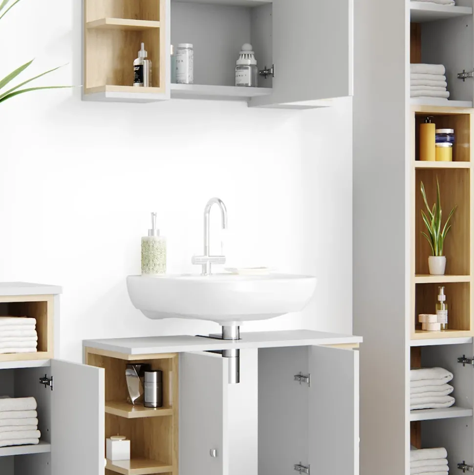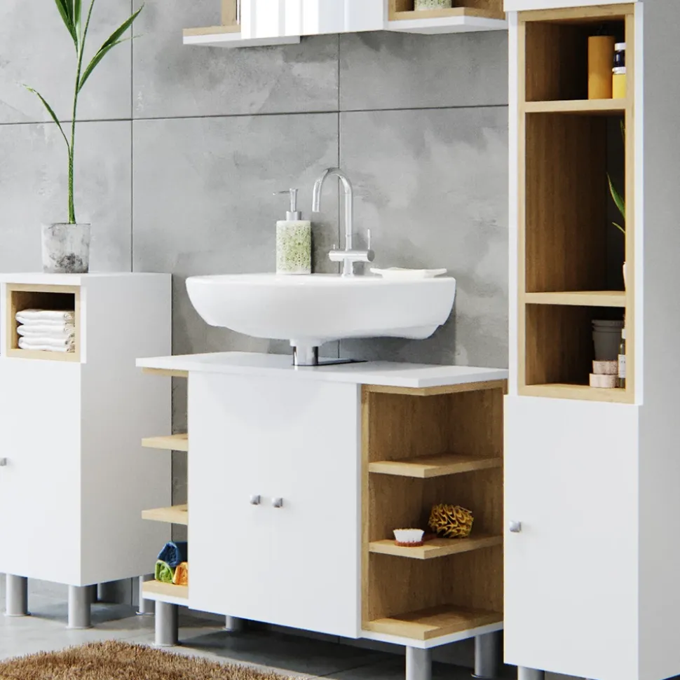 Das Badmöbel Set Aquis ist ein wahrer Blickfang in jedem Badezimmer. Mit dem Waschbeckenunterschrank und dem Spiegelschrank bietet es nicht nur ausreichend Stauraum für all Ihre Badutensilien, sondern auch eine elegante Optik. Besonders praktisch ist die Möglichkeit, die Türöffnung nach Belieben zu ändern. Die bodenstehenden Schränke mit Metallfüßen und reichlich Stauraum machen das Aquis-Set zum perfekten Begleiter für ordnungsliebende Badliebhaber. Und das Beste: Sie können das Set jederzeit durch weitere Teile aus der Aquis-Kollektion ergänzen und somit Ihr Traumbadezimmer kreieren. Gönnen Sie sich jetzt das Aquis-Set – Ihr Bad wird es Ihnen danken.