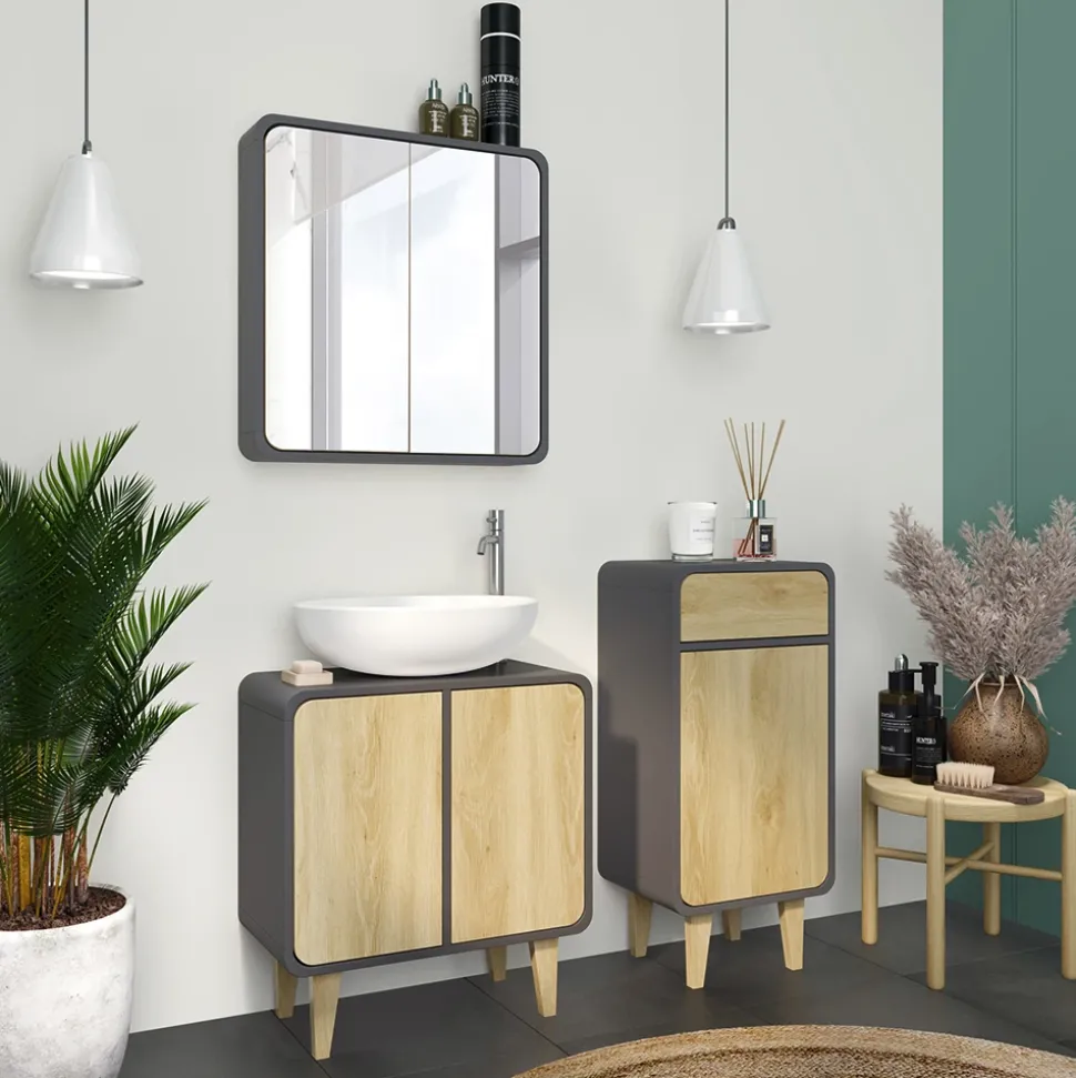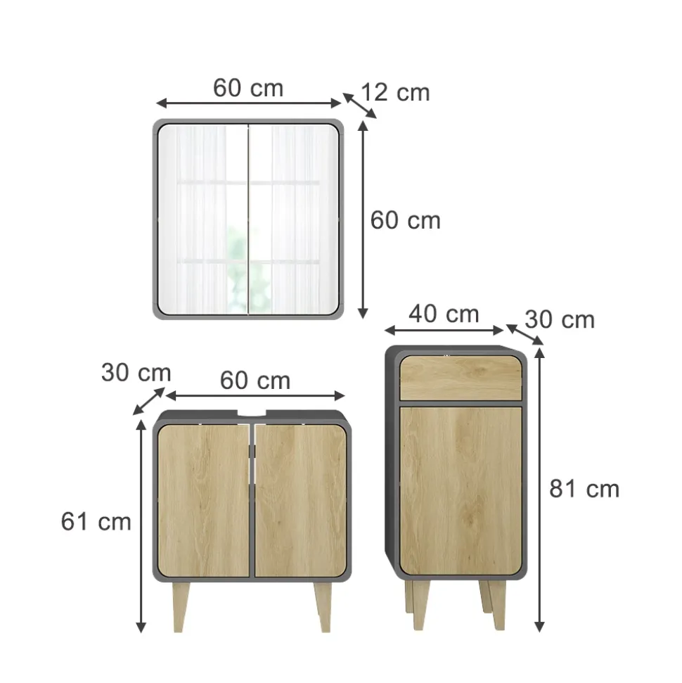- LIEFERUMFANG: Badspiegelschrank, Waschbeckenunterschrank, Midischrank, Montageanleitung, Montagematerial (Dekoration nicht enthalten)
