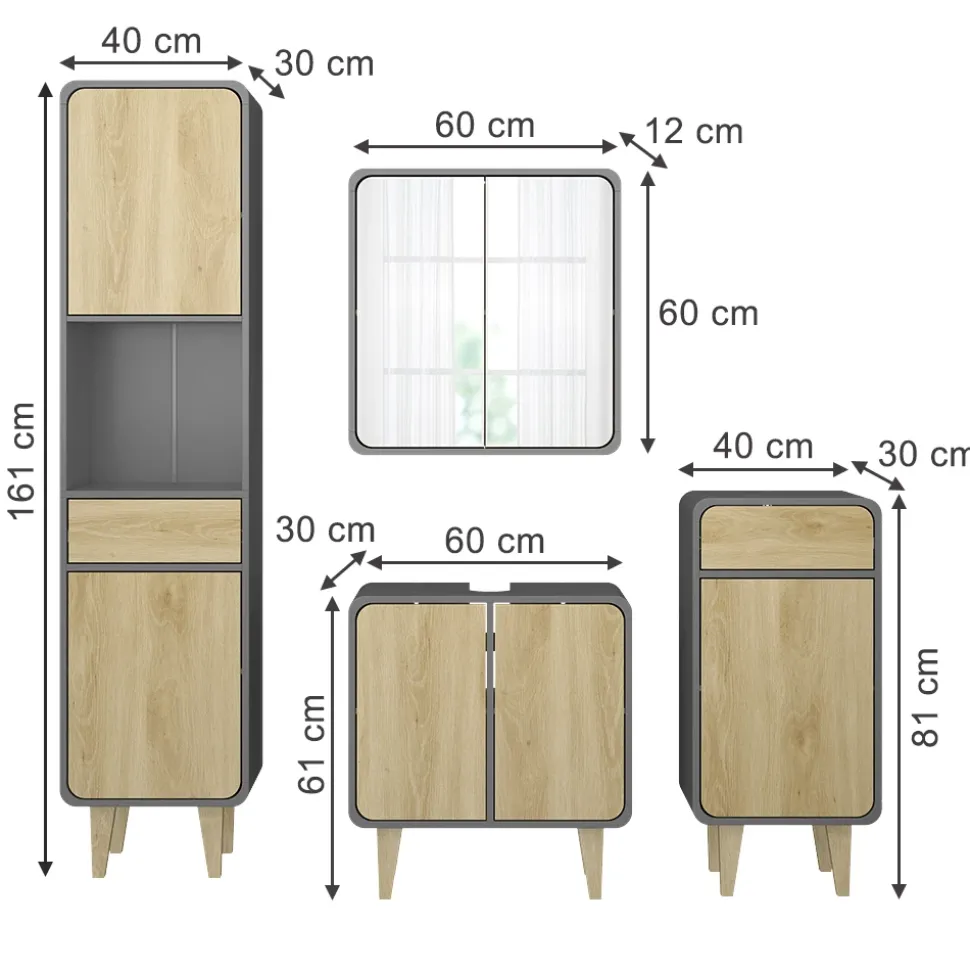 - LIEFERUMFANG: Badspiegelschrank, Waschbeckenunterschrank, Midischrank, Hochschrank, Montageanleitung, Montagematerial (Dekoration nicht enthalten)