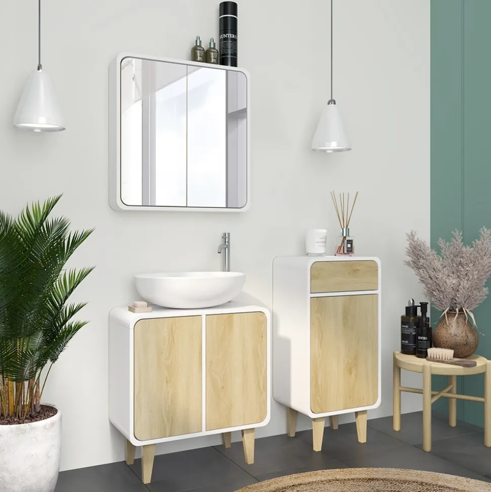 - LIEFERUMFANG: Badspiegelschrank, Waschbeckenunterschrank, Midischrank, Montageanleitung, Montagematerial (Dekoration nicht enthalten)