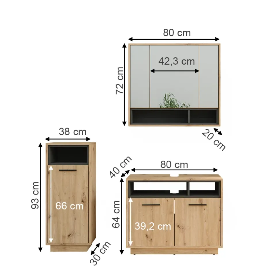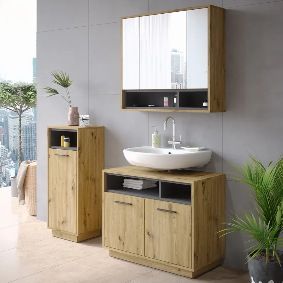 Unsere Badmöbelserie gibt es in vier unterschiedlichen Farbvarianten. Hoch modern und funktional kann man bei den Farben zwischen Anthrazit, Weiß, Artisan-Eiche und Grau wählen, welche jeweils mit edlen Eiche – oder Anthrazit-Einschüben ergänzt sind. Diese Design-Highlights werden sich hervorragend in jedes Bad einfügen und machen es zu einem Hingucker in jedem Zuhause.