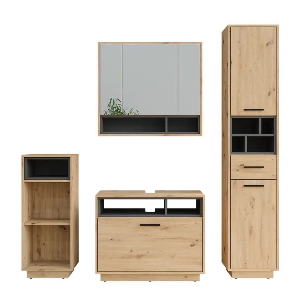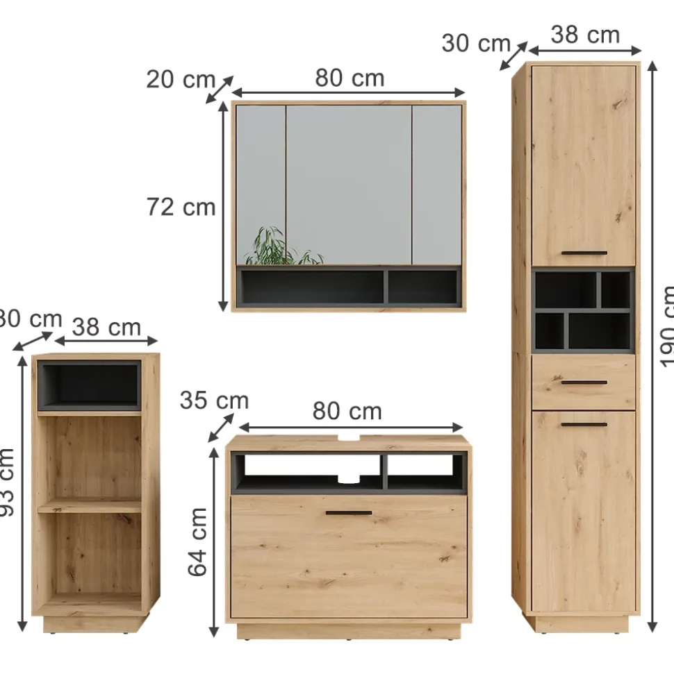LIEFERUMFANG: Waschbeckunterschrank, Spiegelschrank, Midischrank, Hochschrank, Montageanleitung, Montagematerial (Dekoration nicht enthalten).