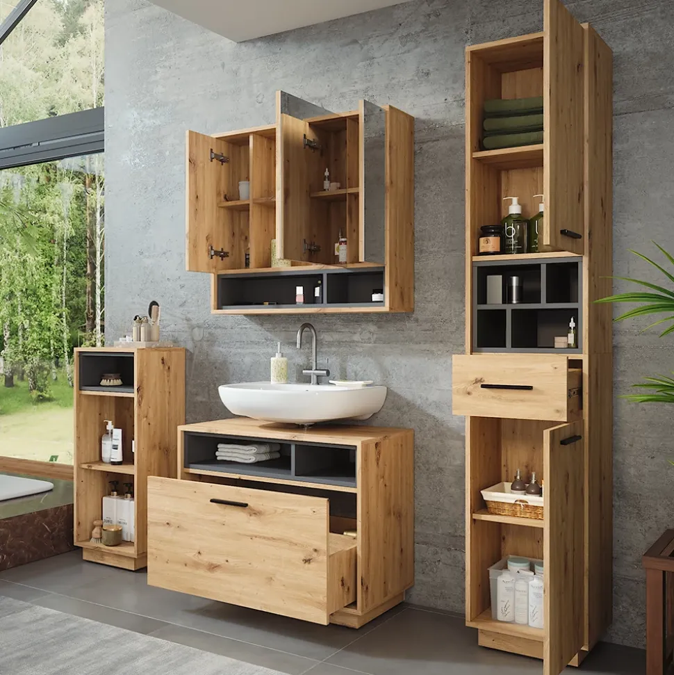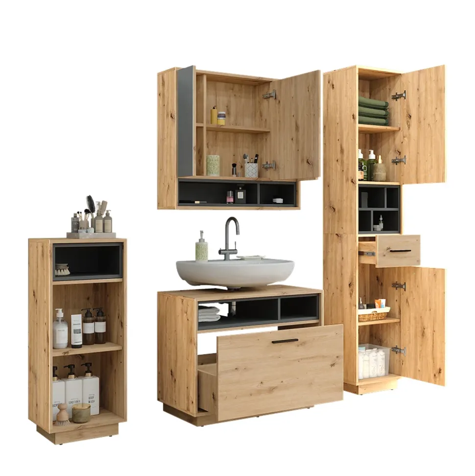 - Das Badezimmerschrank-Set besticht durch sein modernes Design und die hochwertige Verarbeitung. Mit ausreichend Stauraum und praktischen Funktionen ist es die ideale Ergänzung für jedes Badezimmer.