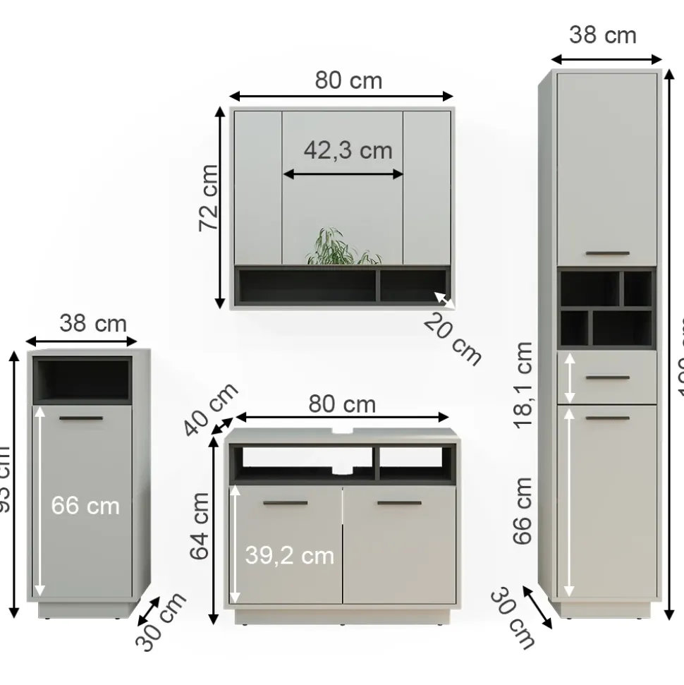 - LIEFERUMFANG: Badspiegelschrank, Waschbeckenunterschrank, Midischrank, Hochschrank, Montageanleitung, Montagematerial.