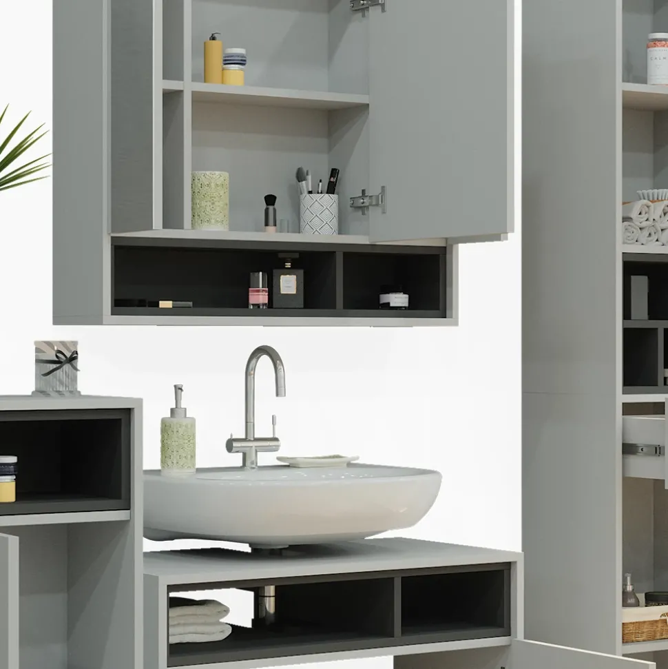 Unsere Badmöbelserie gibt es in vier unterschiedlichen Farbvarianten. Hoch modern und funktional kann man bei den Farben zwischen Anthrazit, Weiß, Artisan-Eiche und Grau wählen, welche jeweils mit edlen Eiche – oder Anthrazit-Einschüben ergänzt sind. Diese Design-Highlights werden sich hervorragend in jedes Bad einfügen und machen es zu einem Hingucker in jedem Zuhause.