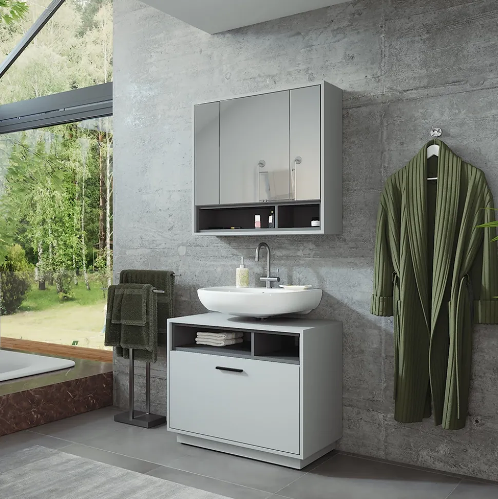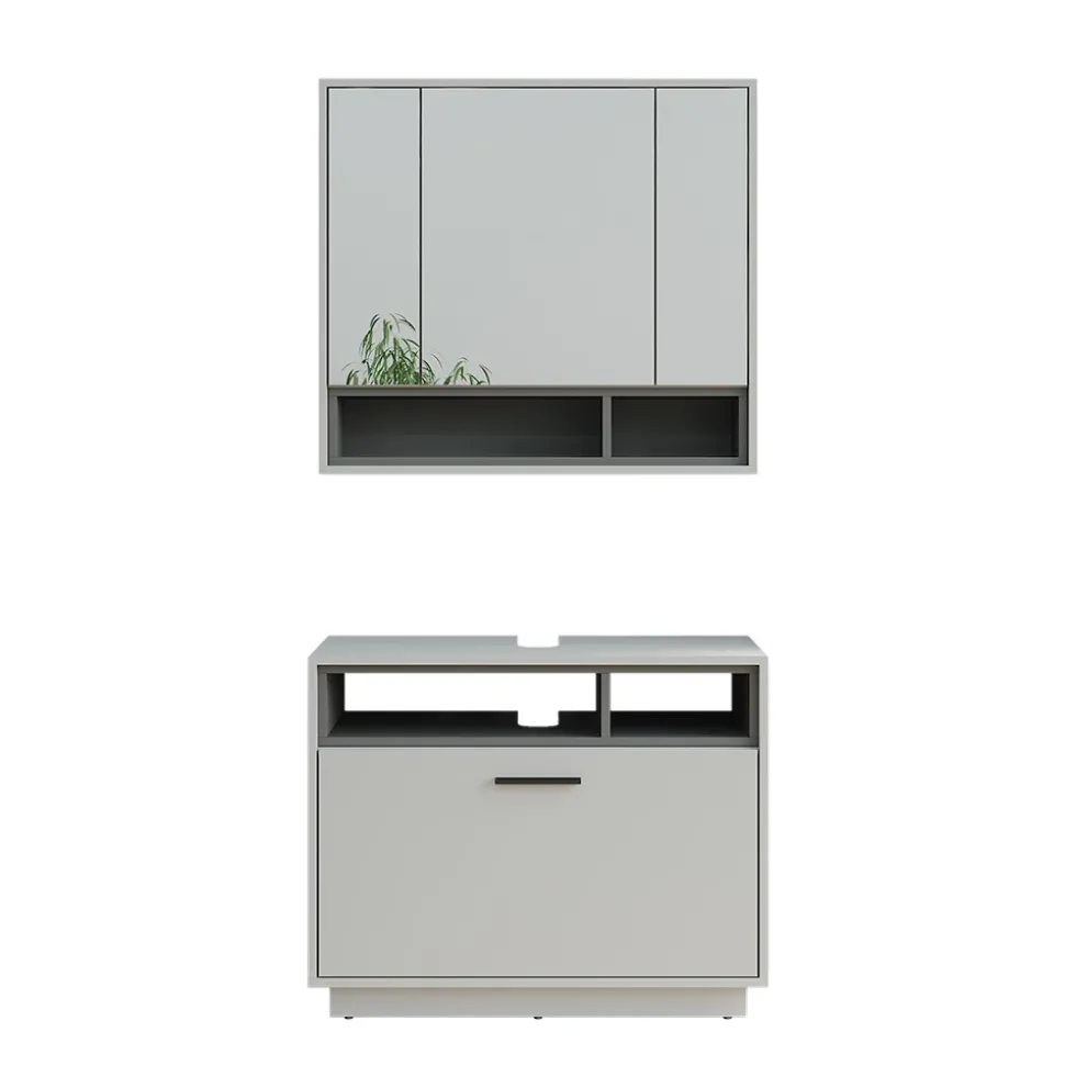 Setzen Sie auf klare Linien und durchdachte Funktion: Das zweiteilige Badmöbel-Set „Beatrice“ bringt mit Waschbeckenunterschrank und Spiegelschrank eine harmonische Kombination in Ihr Badezimmer. Beide Elemente sind im Design abgestimmt und bieten praktischen Stauraum für Alltagsgegenstände wie Pflegeprodukte oder Handtücher. So entsteht ein strukturierter Eindruck im Raum – funktional, modern und alltagstauglich.