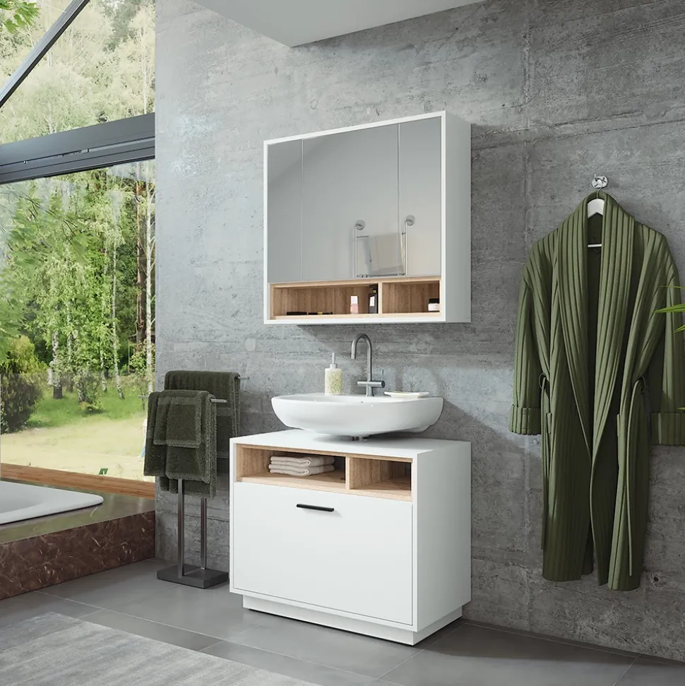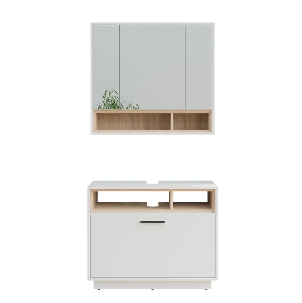 Setzen Sie auf klare Linien und durchdachte Funktion: Das zweiteilige Badmöbel-Set „Beatrice“ bringt mit Waschbeckenunterschrank und Spiegelschrank eine harmonische Kombination in Ihr Badezimmer. Beide Elemente sind im Design abgestimmt und bieten praktischen Stauraum für Alltagsgegenstände wie Pflegeprodukte oder Handtücher. So entsteht ein strukturierter Eindruck im Raum – funktional, modern und alltagstauglich.