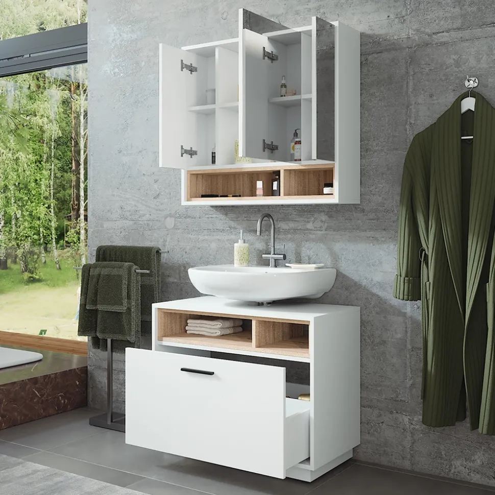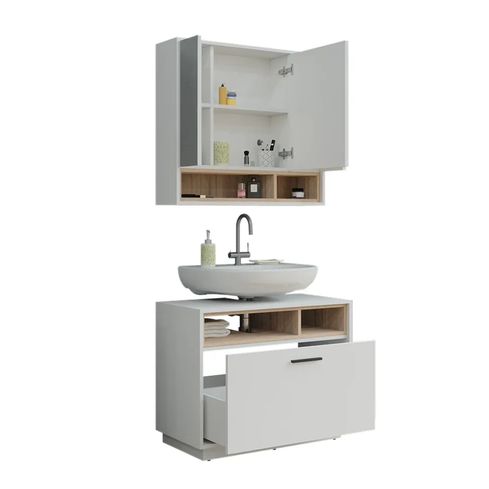 - MATERIAL: Das Badmöbel-Set besteht aus einer pflegeleichten 16 mm Spanplatte mit Melaminharzbeschichtung.