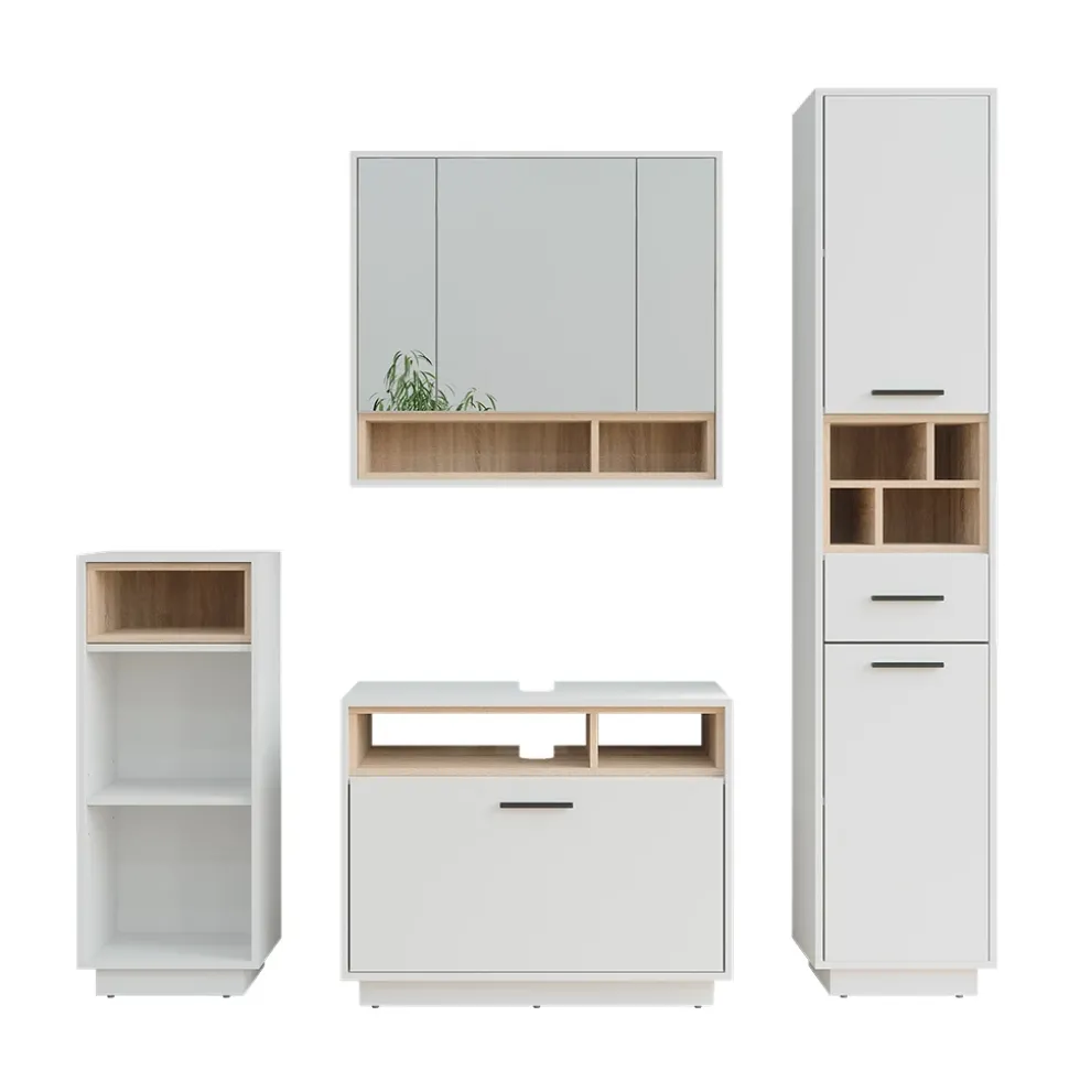 - LIEFERUMFANG: Waschbeckunterschrank, Spiegelschrank, Midischrank, Hochschrank, Montageanleitung, Montagematerial (Dekoration nicht enthalten)