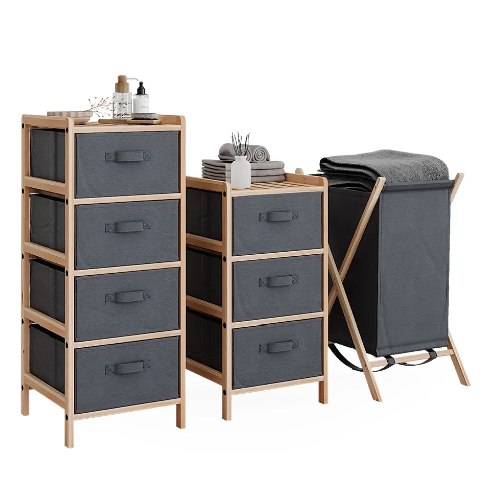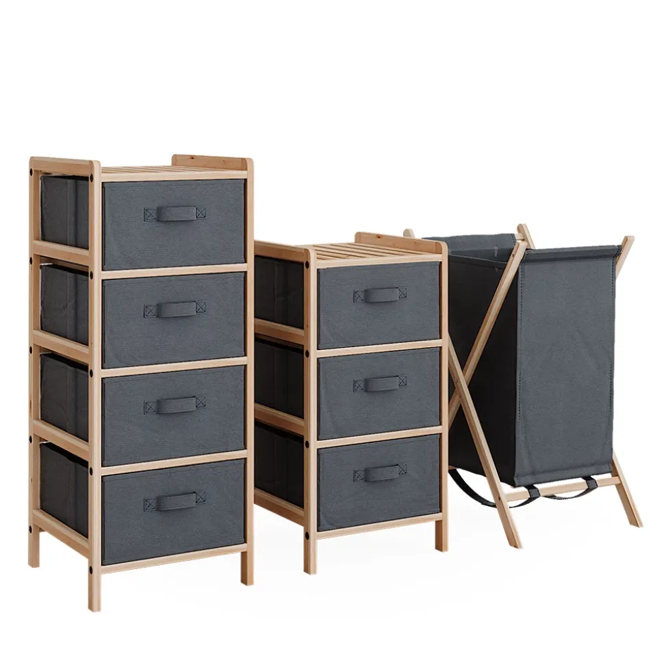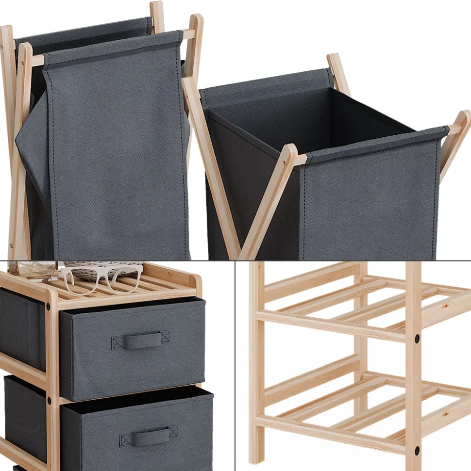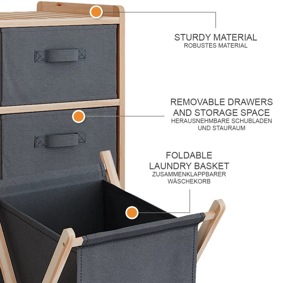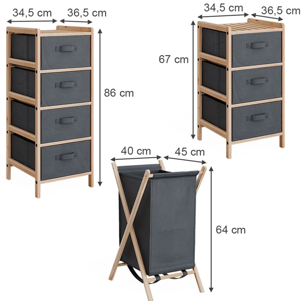 - MATERIAL: Die Gestelle bestehen aus Tannenholz; die Schubladen aus Papierfaserstoff mit Vlies und der Wäschekorb aus Polyester.