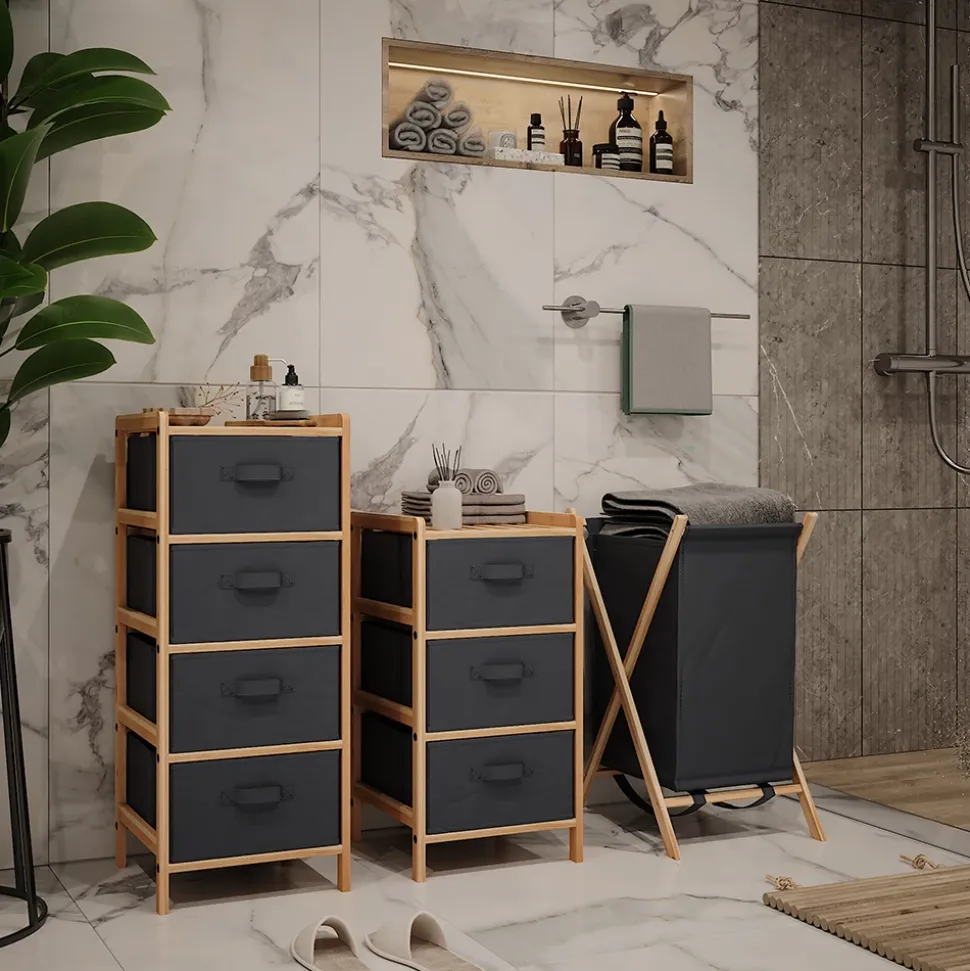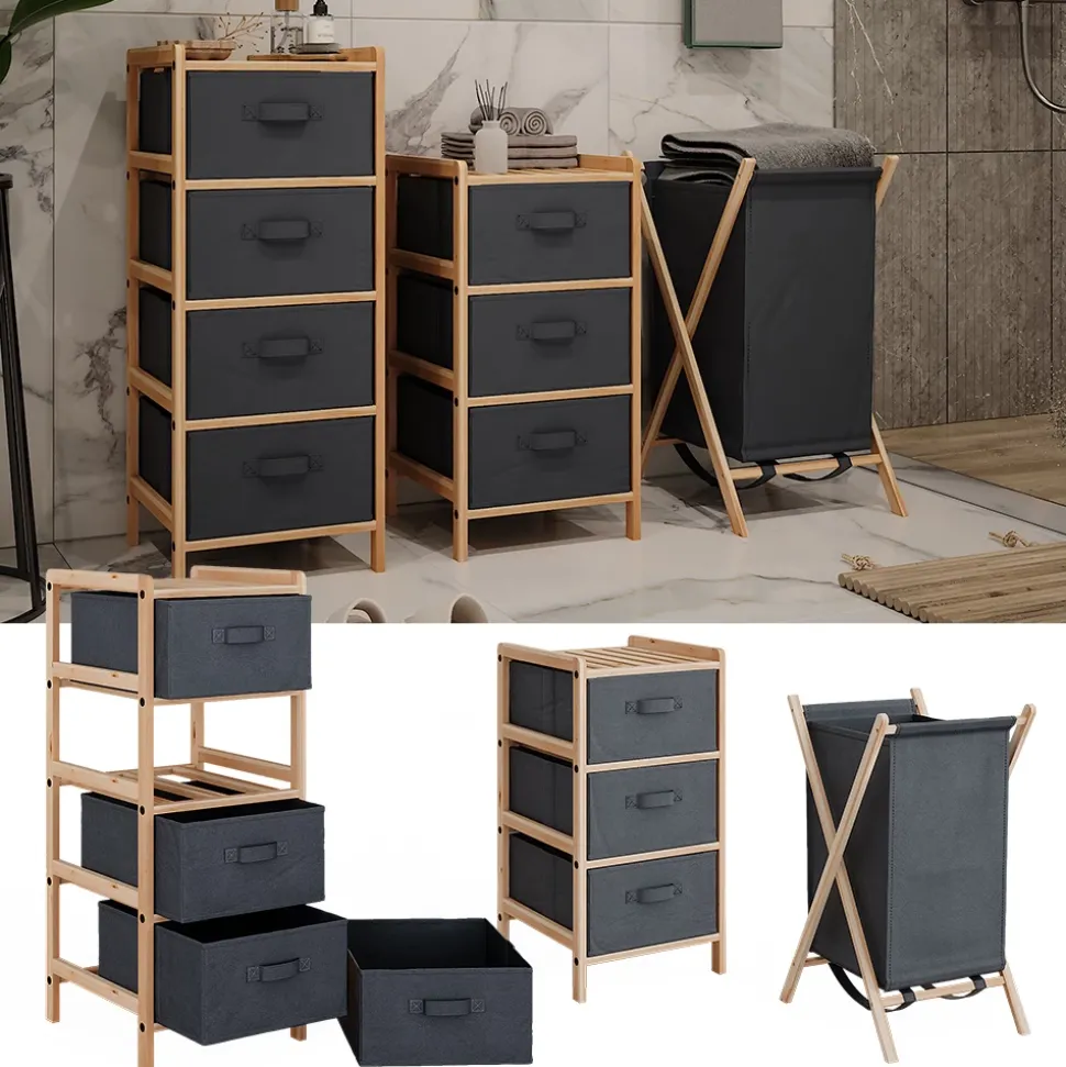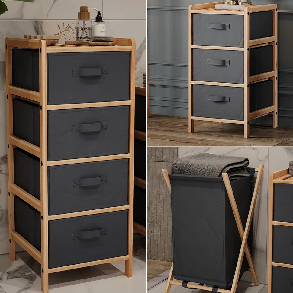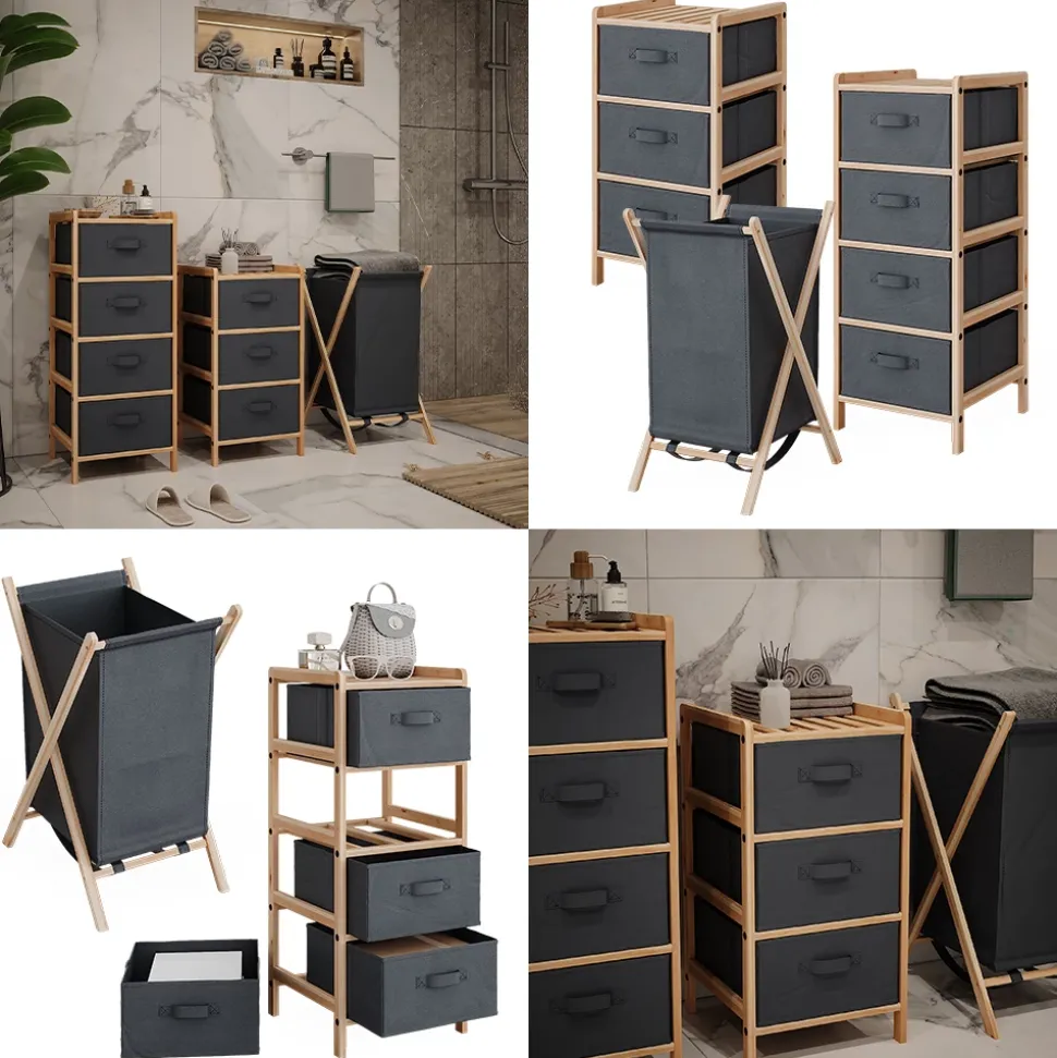 Das Bruno – Möbel-Set ist die perfekte Ergänzung für jedes Zuhause. Mit seinem funktionellen Design und reichlich Stauraum bietet dieses Ensemble alles, was Sie brauchen, um Ihr Heim ordentlich und aufgeräumt zu halten. Das Set besteht aus zwei Kommoden mit je 3 und 4 Stoffschubladen und einem Wäschekorb, um all Ihre Gegenstände zu verstauen. Organisieren Sie sich mit unserer Bruno – Kollektion und machen Sie Ihr Badezimmer zu einem Ort, an dem Sie sich entspannen und erholen können. Gönnen Sie sich dieses Möbel-Set und genießen Sie das Luxusgefühl während Sie es jeden Tag benutzen.
