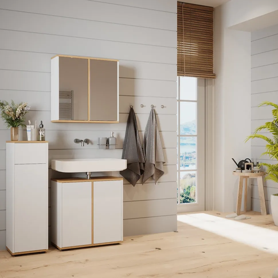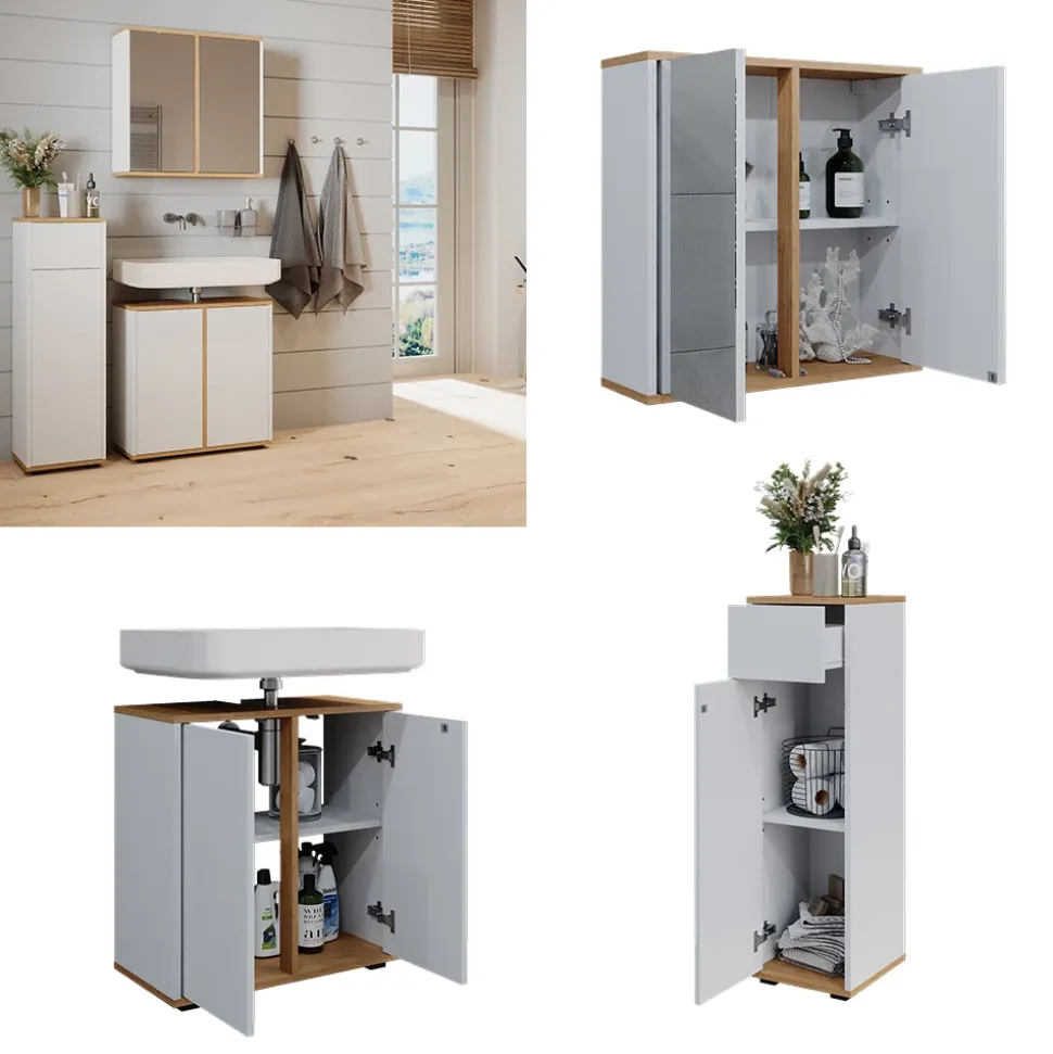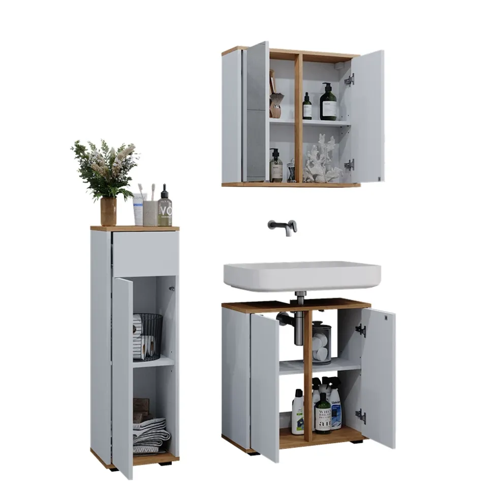 Das Badmöbel-Set Didi ist ein traumhaftes Ensemble aus Waschbeckenunterschrank, Spiegelschrank und Midischrank. Das innovative Design und die Push-to-Open – Funktion machen das Öffnen und Schließen kinderleicht. Die reichlich vorhandenen Stauräume sorgen für Ordnung und Übersichtlichkeit in Ihrem Bad. Mit Didi sind Ihrer Kreativität und Ihrem Geschmack keine Grenzen gesetzt. Verwöhnen Sie sich mit einem Badezimmer-Set, das Ihre Sinne verwöhnt und Ihre Seele erfrischt.