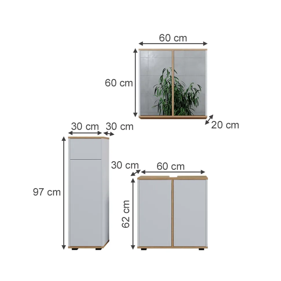 - MATERIAL: Das Set mit dem Spiegelschrank besteht aus pflegeleichter, melaminharzbeschichteter 16 mm Spanplatte