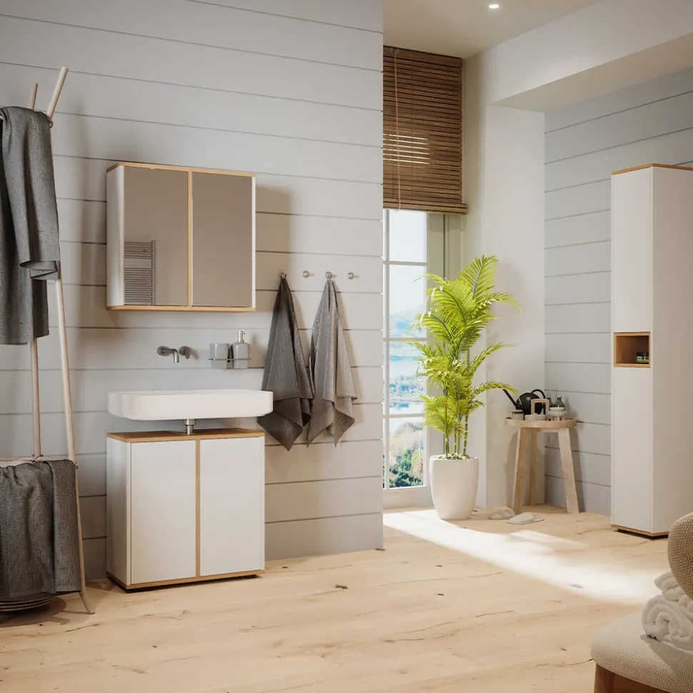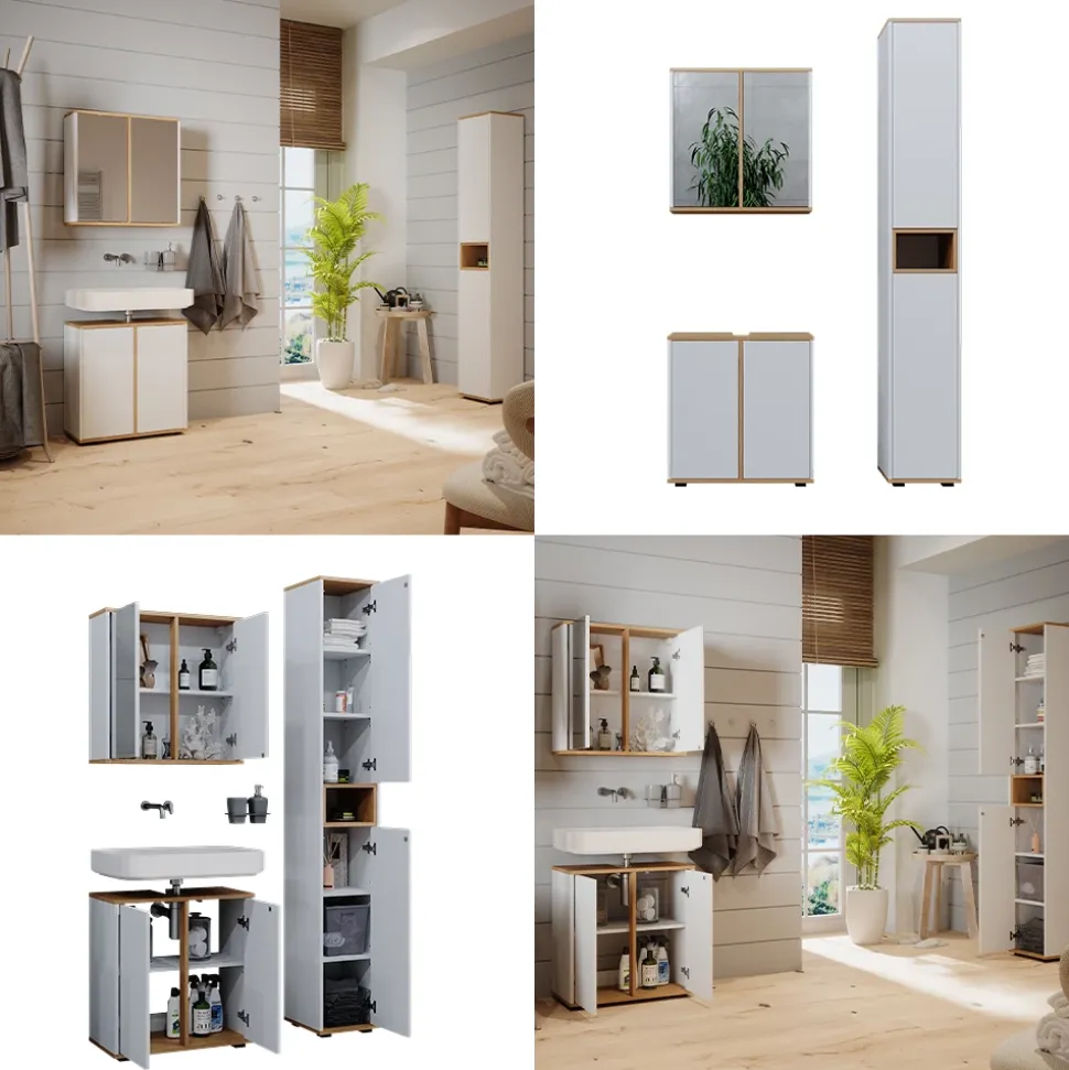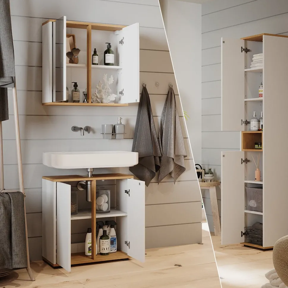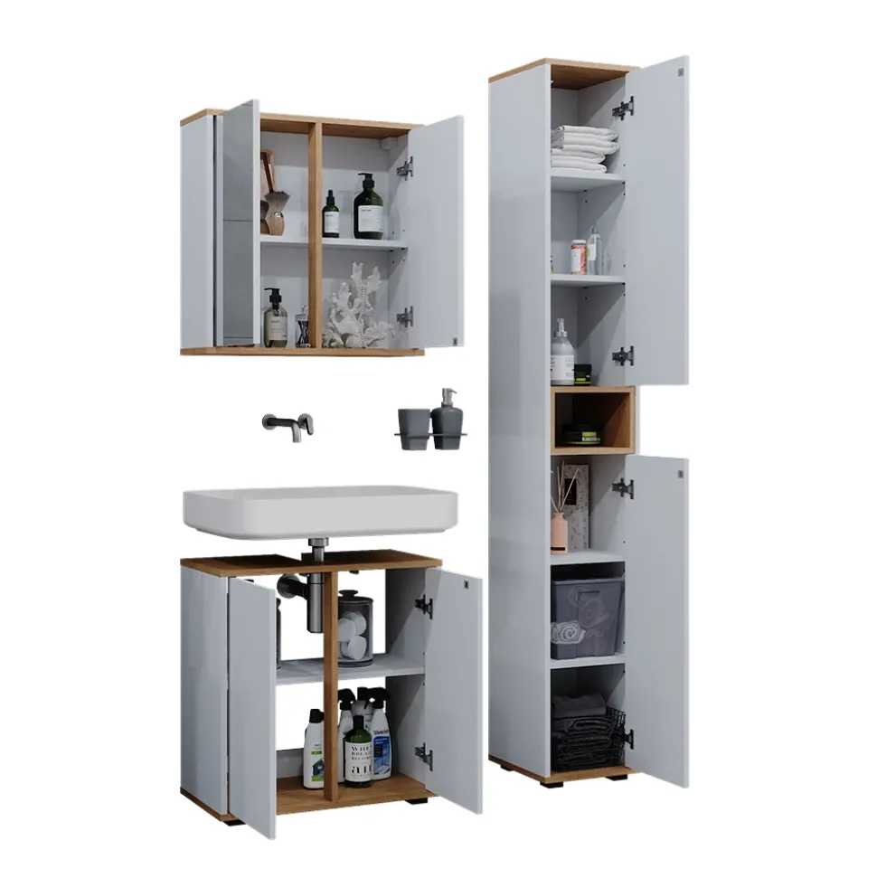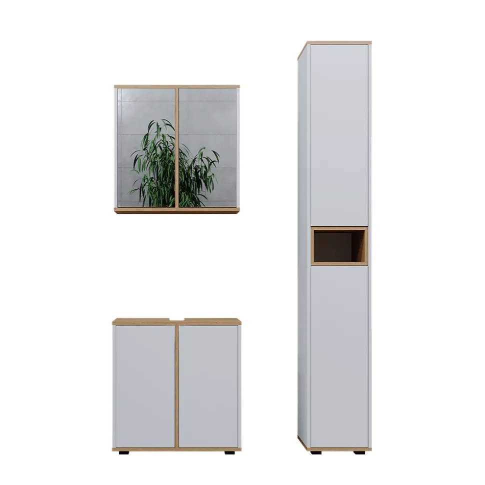 LIEFERUMFANG: Badspiegelschrank, Waschbeckenunterschrank, Hochschrank, Montageanleitung, Montagematerial.