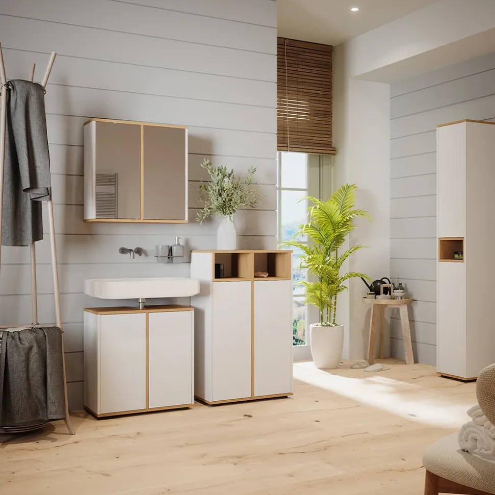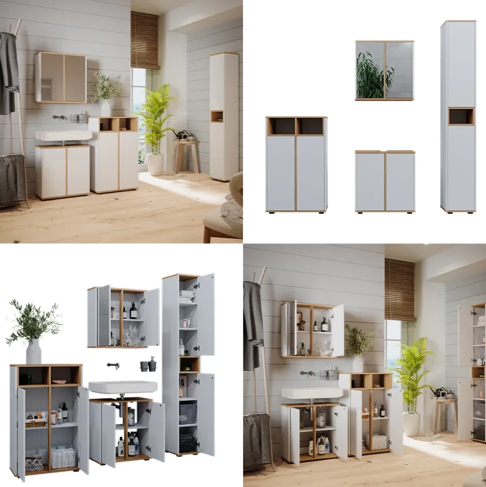 Das Badmöbel-Set Didi ist die perfekte Ergänzung für Ihr Badezimmer! Das Set besteht aus einem Waschbeckenunterschrank, einem Spiegelschrank, einem Hochschrank und einem Midischrank mit 2 Türen. Das innovative Design ist ein echter Hingucker und lässt sich perfekt in jedes Badezimmer integrieren. Dank der Push-to-open – Funktion lassen sich alle Schränke einfach öffnen und schließen. Der reichlich vorhandene Stauraum bietet Platz für alle Ihre Badutensilien. Das Badmöbel-Set Didi ist ein Muss für jeden, der sein Badezimmer stilvoll und funktional einrichten möchte. Holen Sie sich jetzt das Badmöbel-Set Didi und lassen Sie Ihr Badezimmer in einem neuen Glanz erstrahlen!