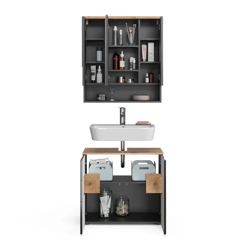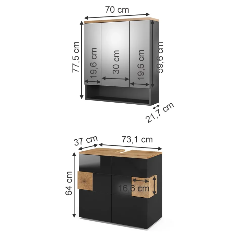 - MATERIAL: Das Set mit dem Spiegelschrank besteht aus pflegeleichter Spanplatte 16 mm, mit einer Melaminharzbeschichtung. Einige Bestandteile des Artikels sind aus MDF gefertigt