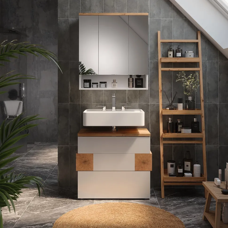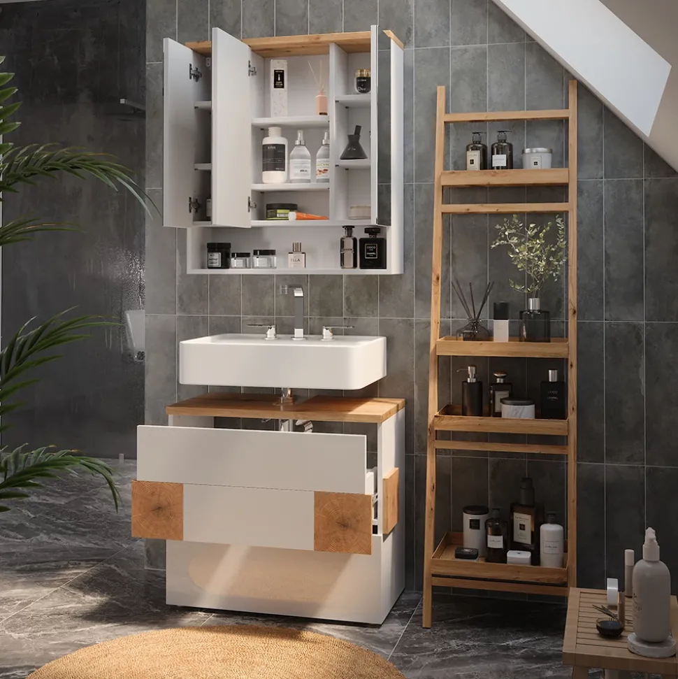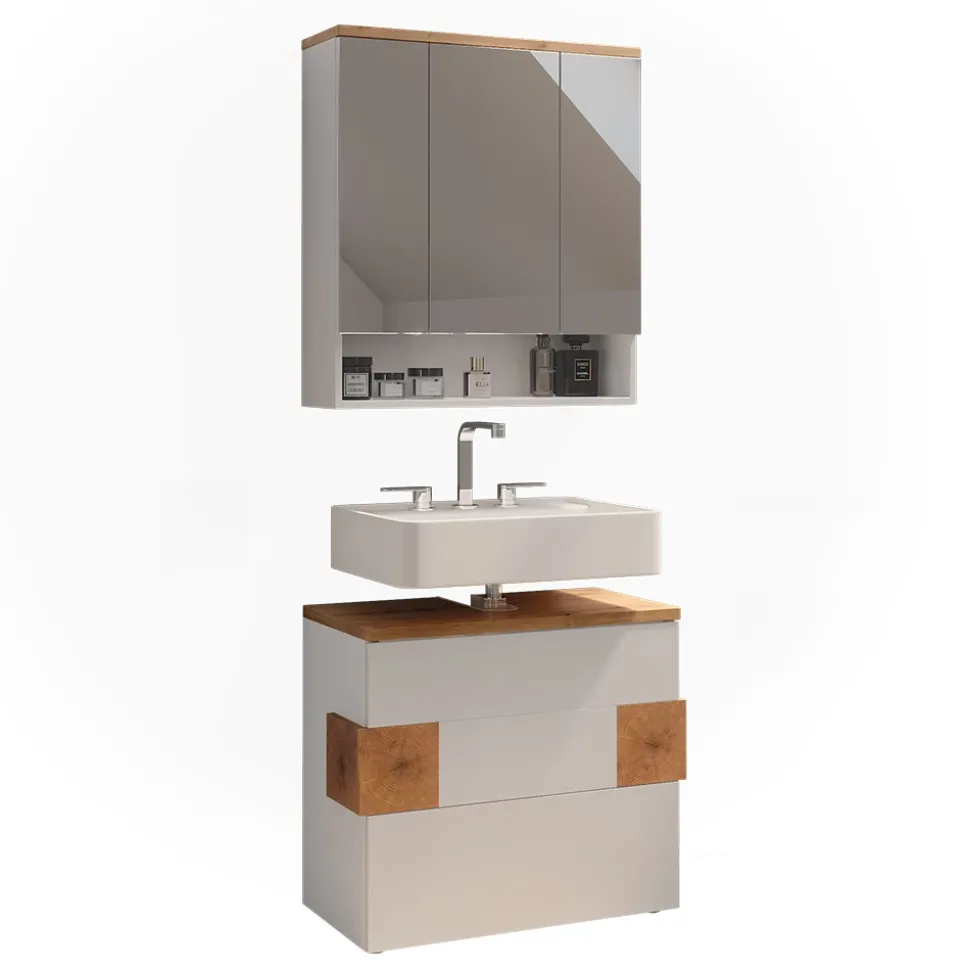 Das Badmöbel-Set „Eden“ ist die perfekte Lösung, um Ihrem Badezimmer einen modernen und praktischen Touch zu verleihen. Das 2-teilige Set besteht aus einem Waschbeckenunterschrank und einem Spiegelschrank, und bietet somit ausreichend Stauraum für all Ihre Badutensilien. Mit seinem kompakten Design passt das Set in jedes Badezimmer und ist einfach zu bedienen. Stellen Sie sich vor, wie organisiert und stilvoll Ihr Badezimmer mit dem „Eden“ Set aussehen wird. Gönnen Sie sich das Upgrade, das Sie und Ihr Badezimmer verdienen!