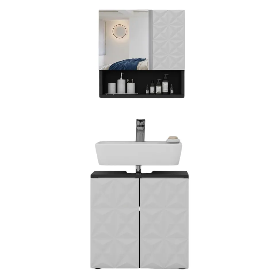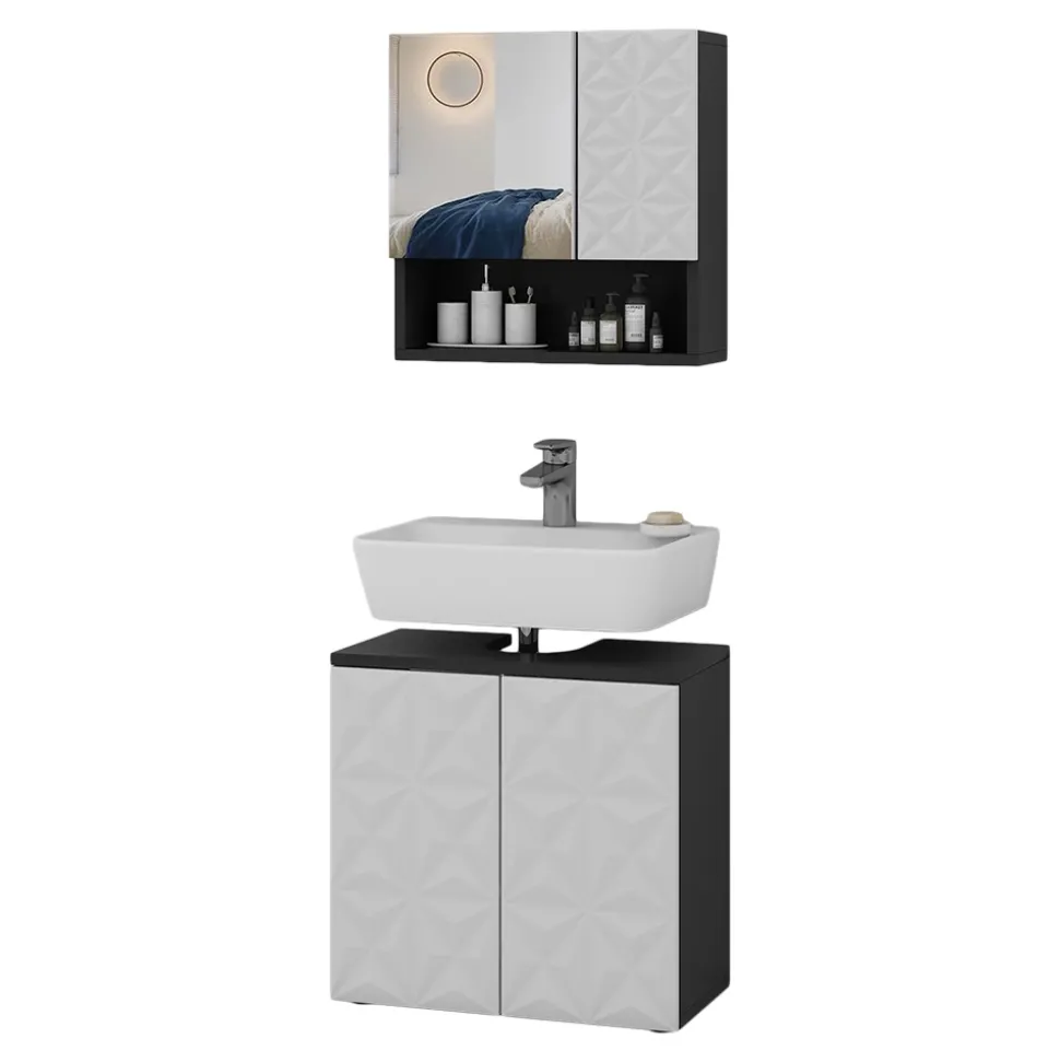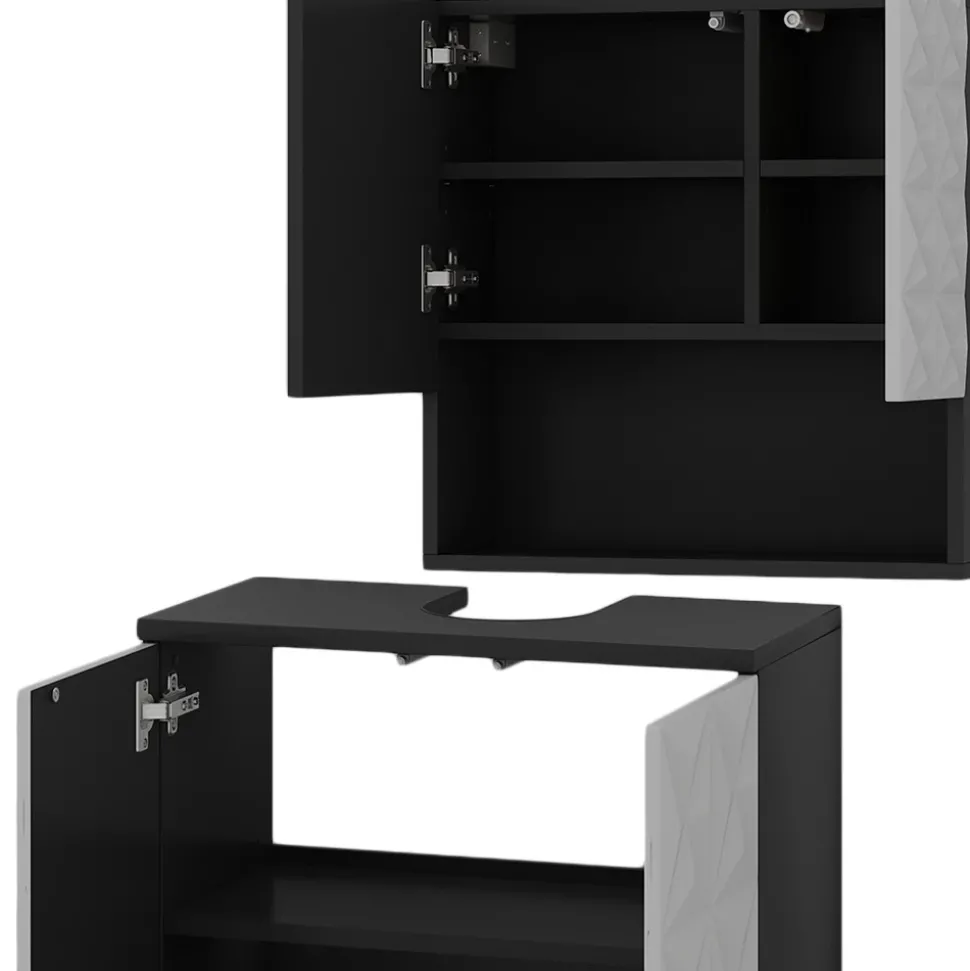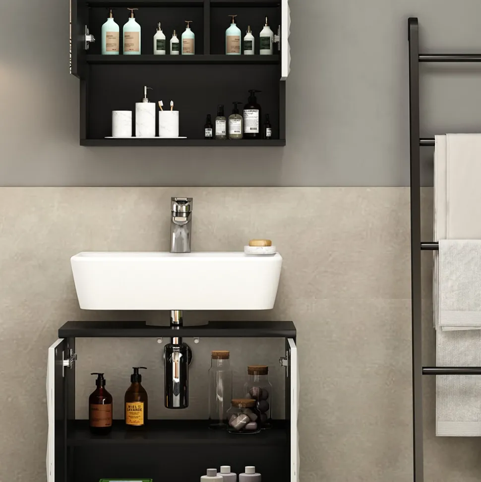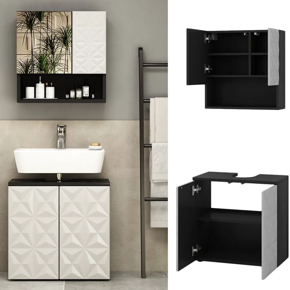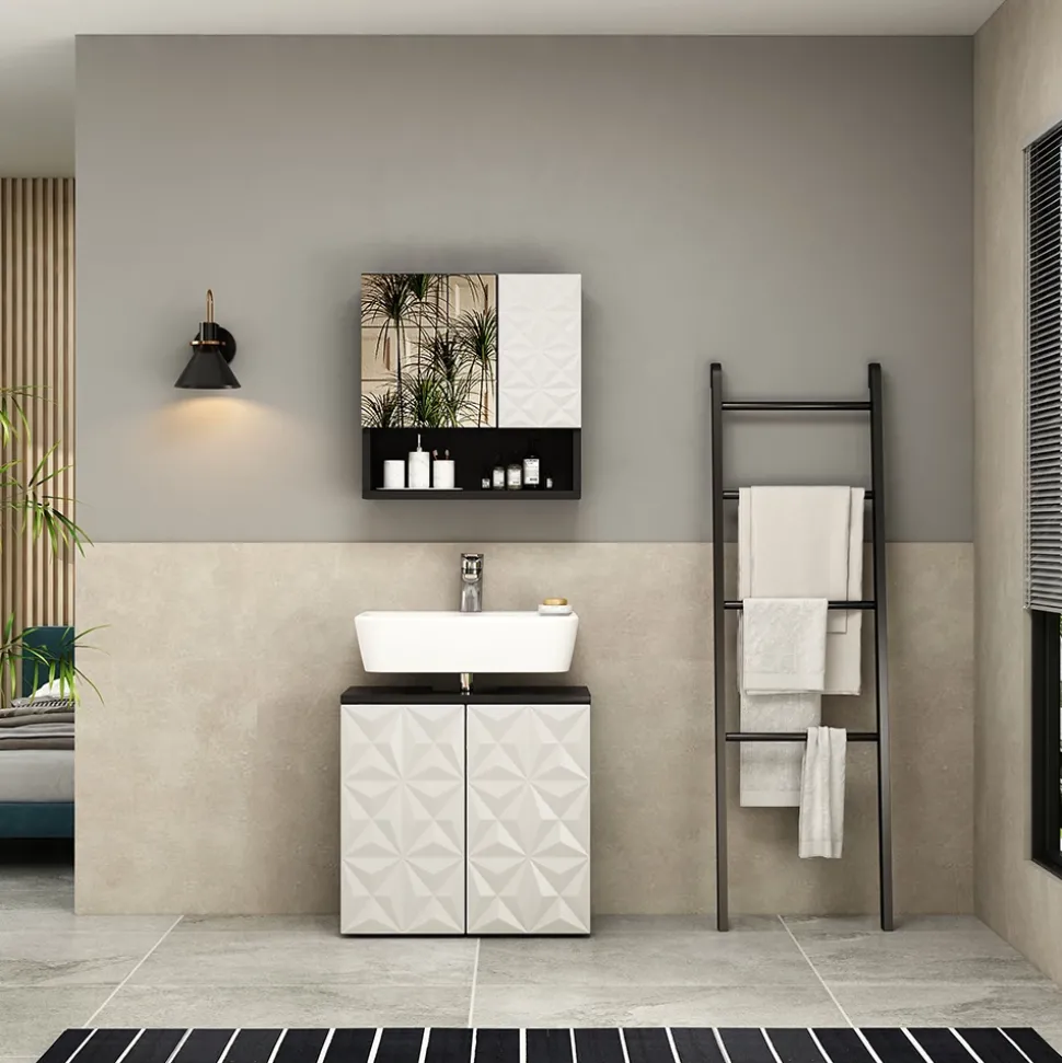 - LIEFERUMFANG: Badezimmerspiegel, Waschbeckenunterschrank, Montageanleitung, Montagematerial.