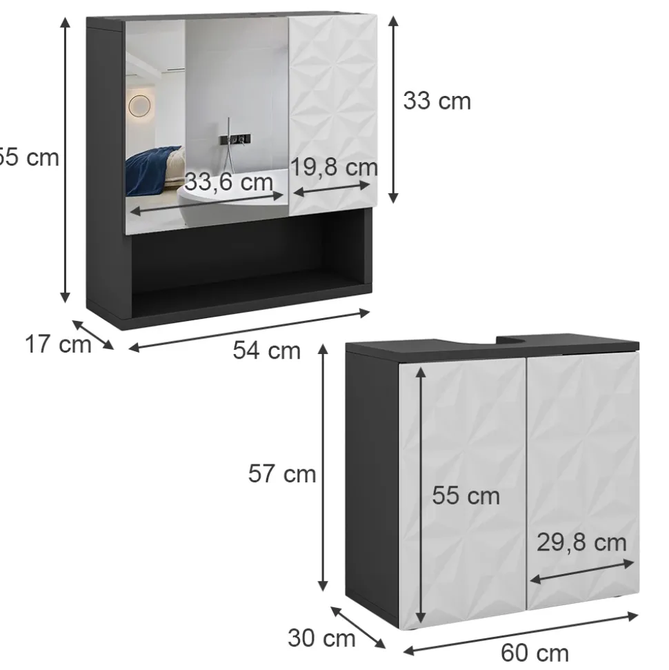- MATERIAL: Das Set mit dem Spiegelschrank besteht aus pflegeleichter Spanplatte 16 mm, mit einer Melaminharzbeschichtung