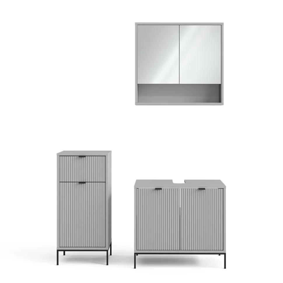- Entdecken Sie das Vicco Badmöbel-Set Eliza in elegantem Grau. Diese moderne Badserie bietet Stauraum mit extravaganten Fronten – eine perfekte Ergänzung für Ihr Badezimmer.