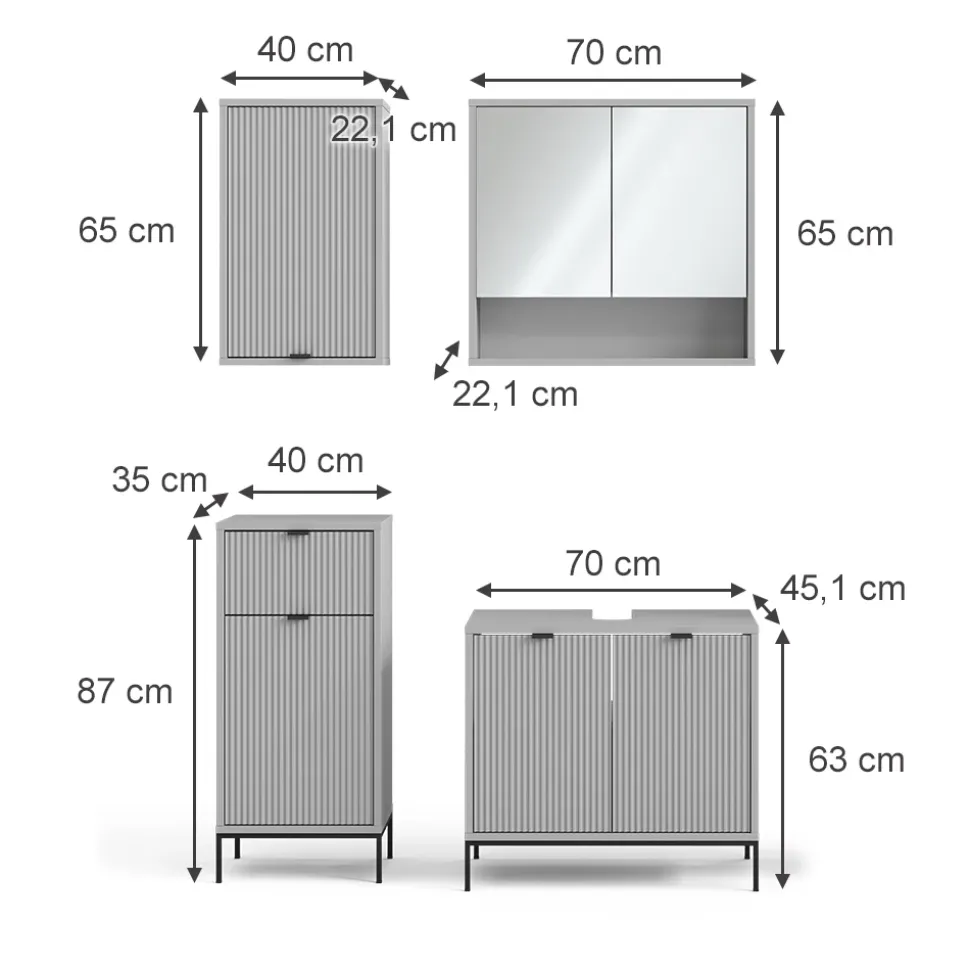 - PRODUKTMAßE: Waschtischunterschrank: 70 x 63 x 45,1 cm, 21,7 kg. Spiegelschrank: 70 x 65 x 22,1 cm, 18,26 kg. Midischrank: 40 x 87 x 35 cm, 18 kg. Hängeschrank: 40 x 65 x 22,1 cm, 10,12 kg.