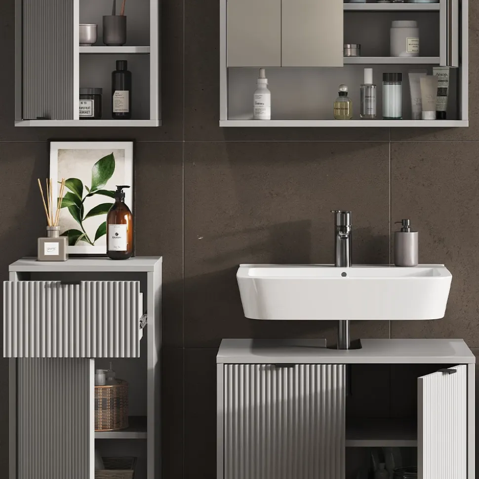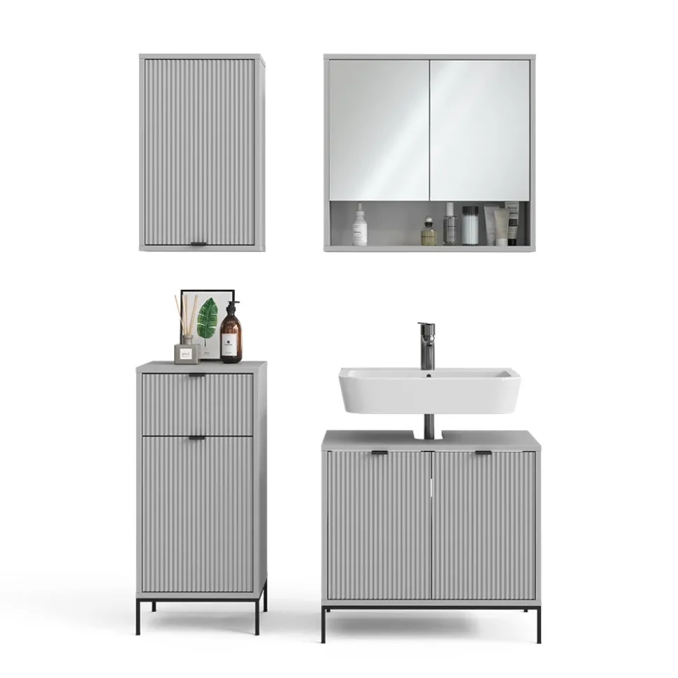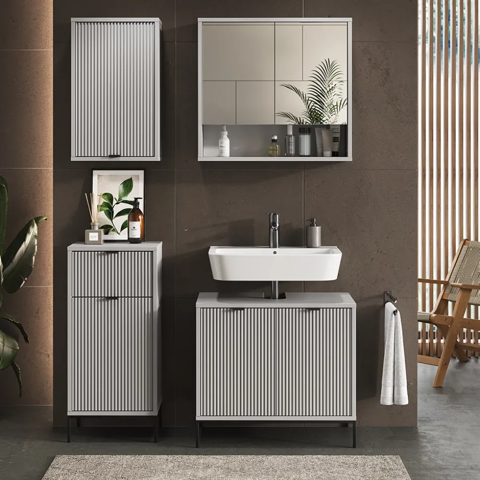 - Entdecken Sie das Vicco Badmöbel-Set Eliza in elegantem Grau. Diese moderne Badserie bietet Stauraum mit extravaganten Fronten – eine perfekte Ergänzung für Ihr Badezimmer.