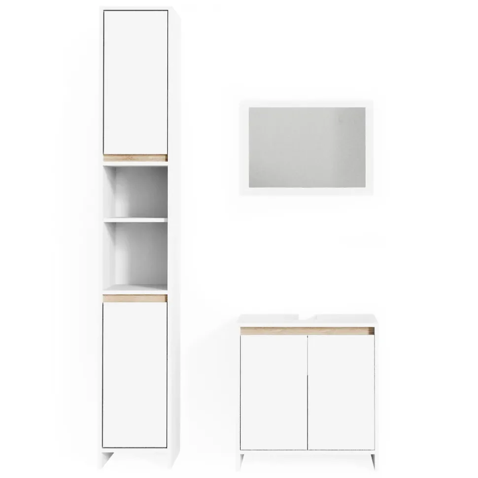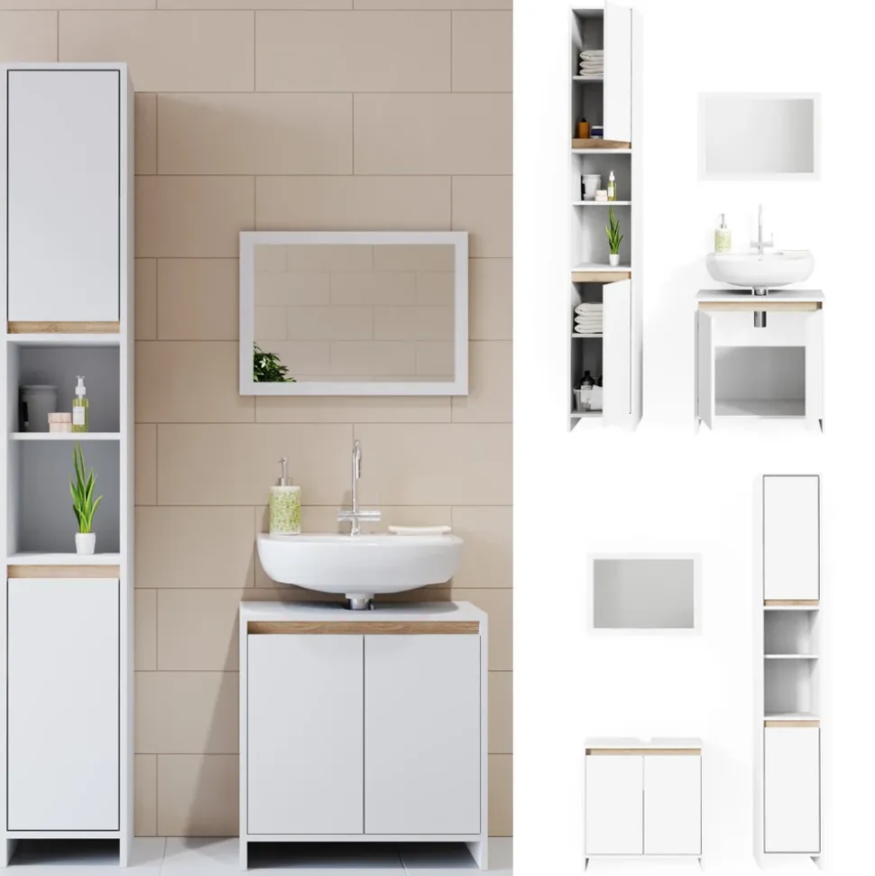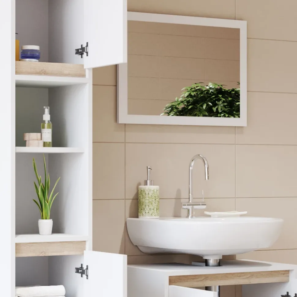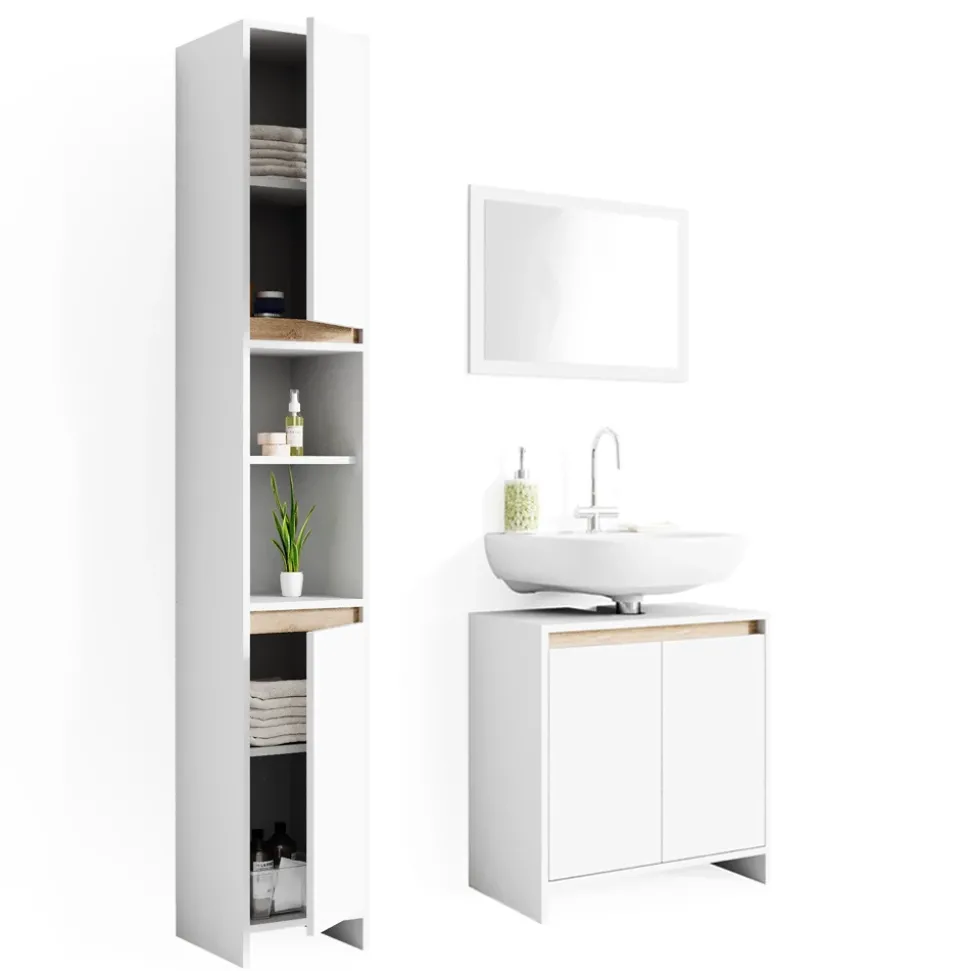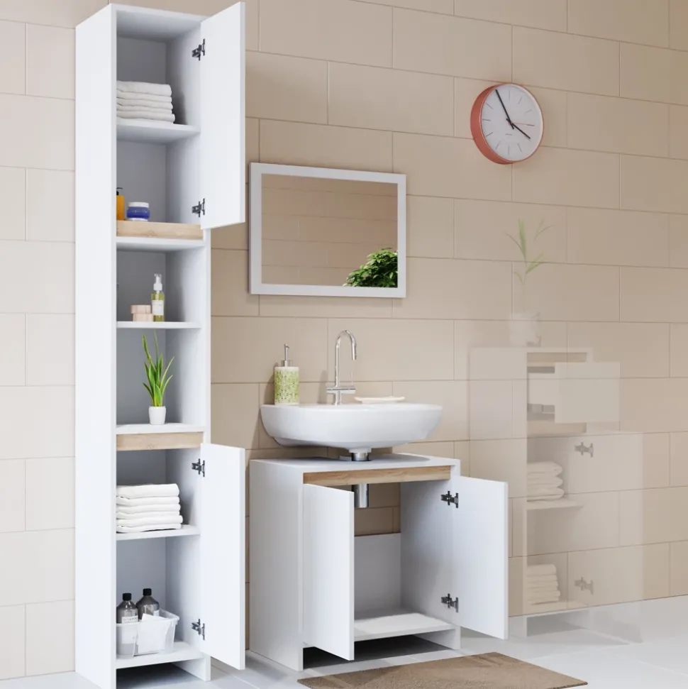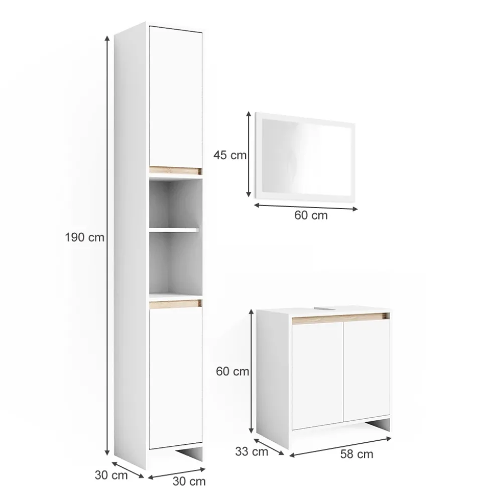 - LIEFERUMFANG: Badezimmerspiegel, Waschbeckenunterschrank, Hochschrank, Montageanleitung, Montagematerial.