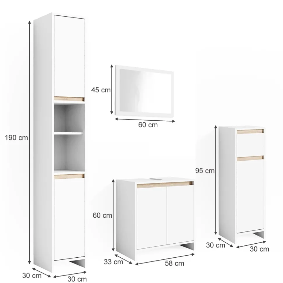 - LIEFERUMFANG: Badezimmerspiegel, Waschbeckenunterschrank, Badschrank, Midischrank, Montageanleitung, Montagematerial.
