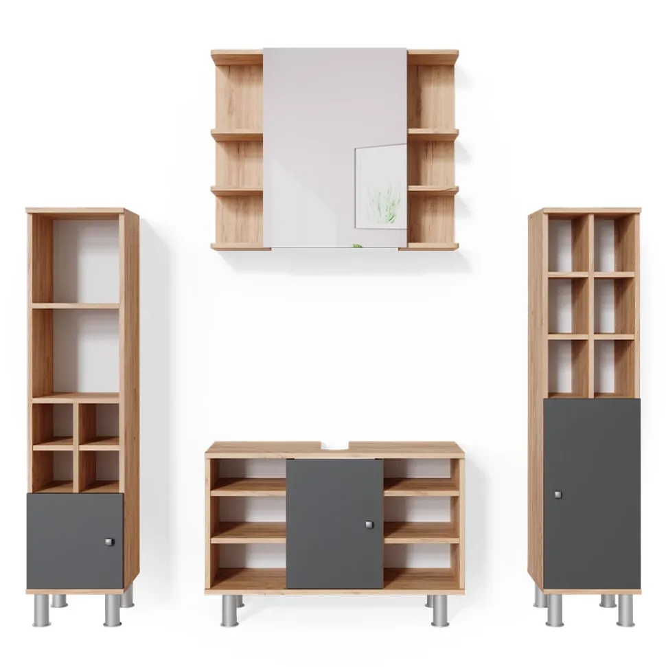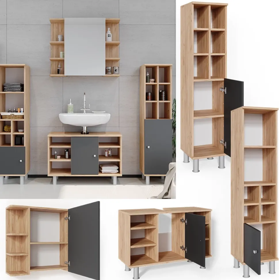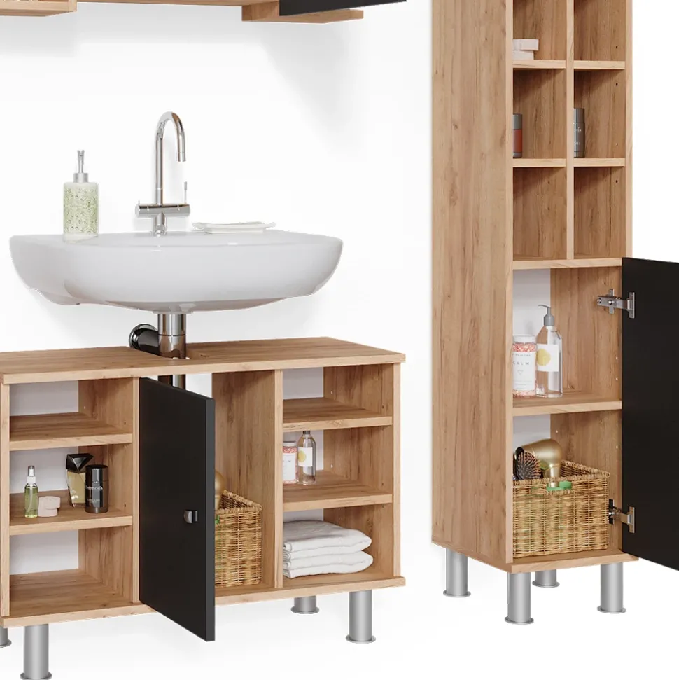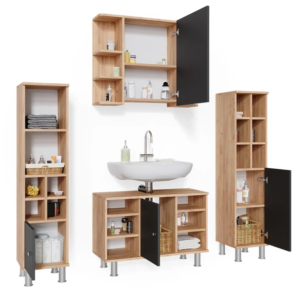 - Das Badezimmerschrank-Set bietet viel Stauraum und ermöglicht es Ihnen, verschiedene Sets zu kombinieren. Metallfüße sorgen für einen stabilen Stand.