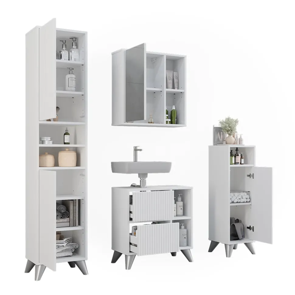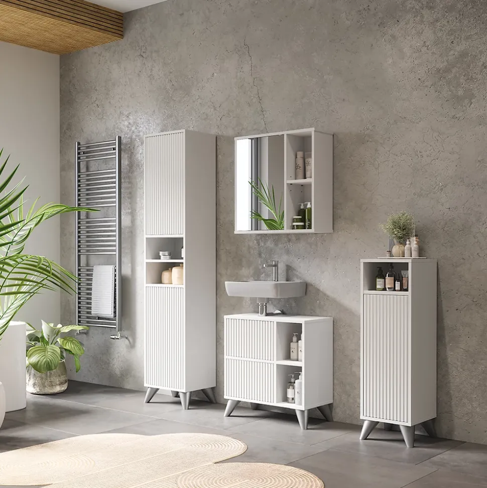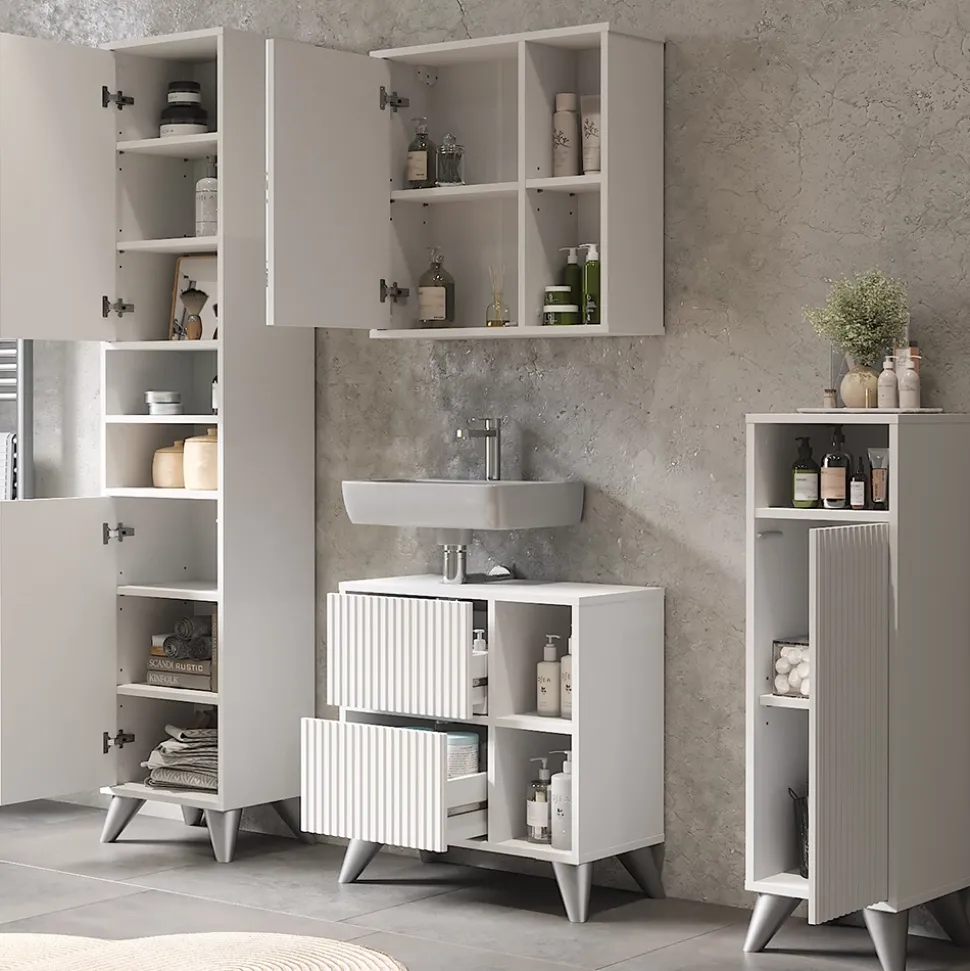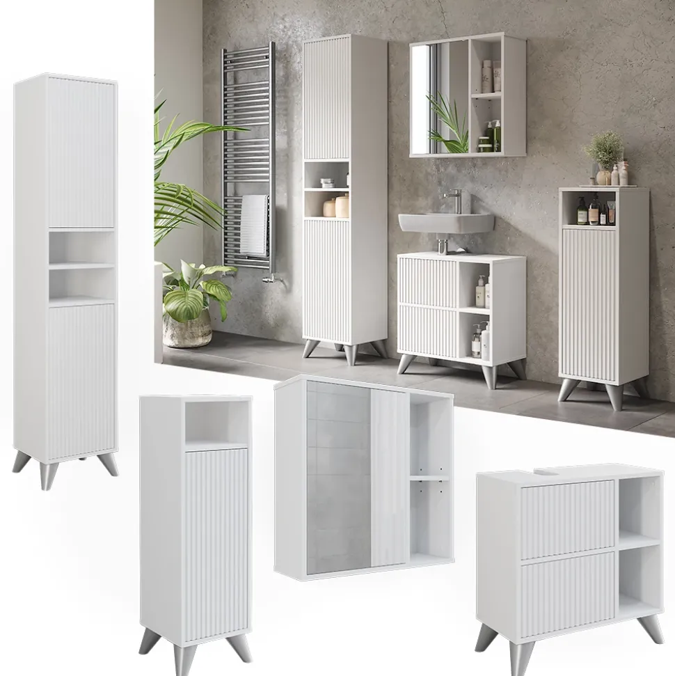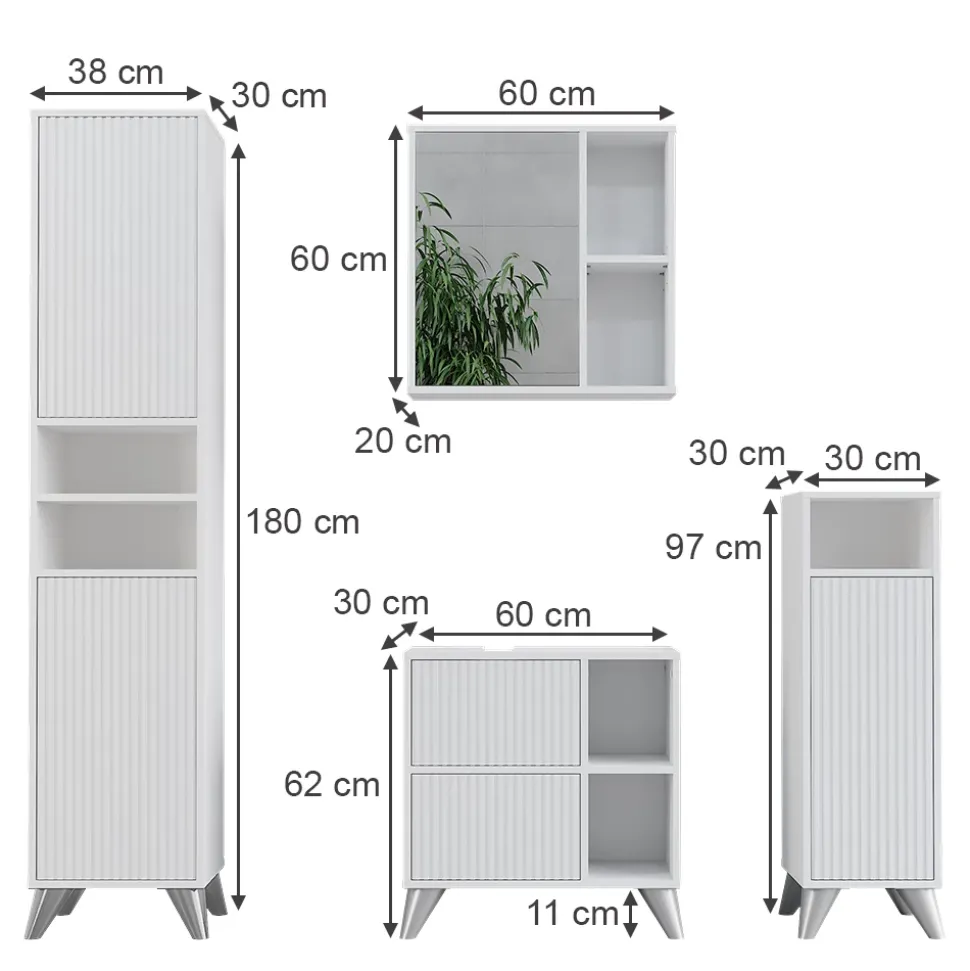 - LIEFERUMFANG: Hochschrank, Badspiegelschrank, Waschbeckenunterschrank, Midischrank, Montageanleitung, Montagematerial (Dekoration nicht enthalten)