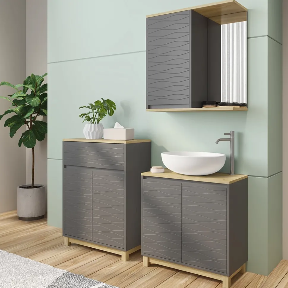 Das Badmöbel-Set Livia ist die perfekte Lösung für Ihr Badezimmer, um Stil und Funktionalität zu vereinen. Mit einem Waschbeckenunterschrank und einem Spiegelschrank bietet dieses Set nicht nur ausreichend Stauraum, sondern verleiht Ihrem Badezimmer auch eine elegante Note. Bringen Sie Ordnung in Ihr Bad und verwandeln Sie es in Ihre persönliche Wohlfühloase. Gönnen Sie sich und Ihrem Zuhause das Beste und investieren Sie in das Badmöbel-Set Livia – denn Sie verdienen es, sich jeden Tag wie im Spa zu fühlen.