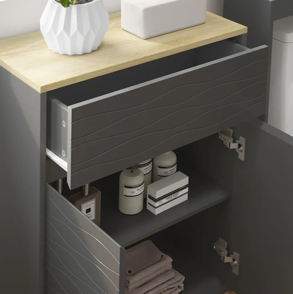 Der Toilettenschrank Livia kombiniert stilvolles Design mit praktischer Funktionalität. Mit seinen großzügigen Stauraummöglichkeiten und der natürlichen Farbgebung bringt er Ordnung und Wärme in jedes Badezimmer.
