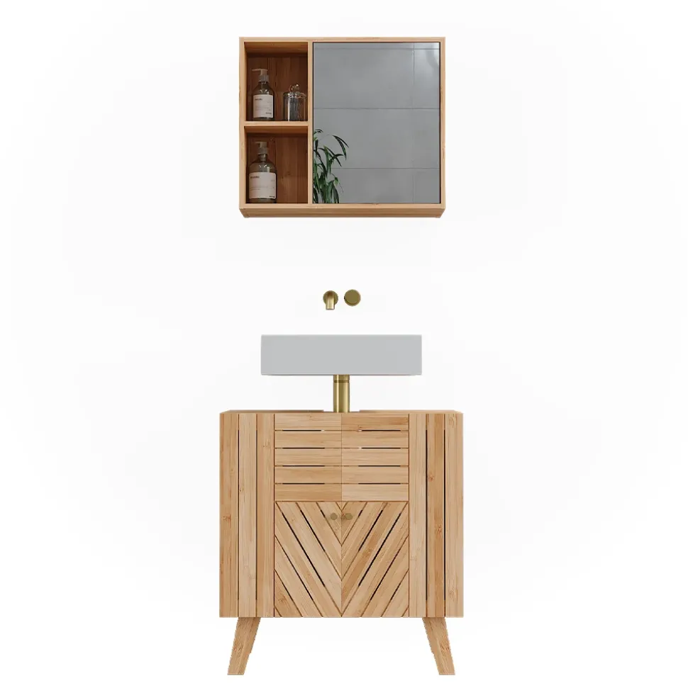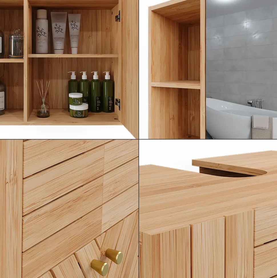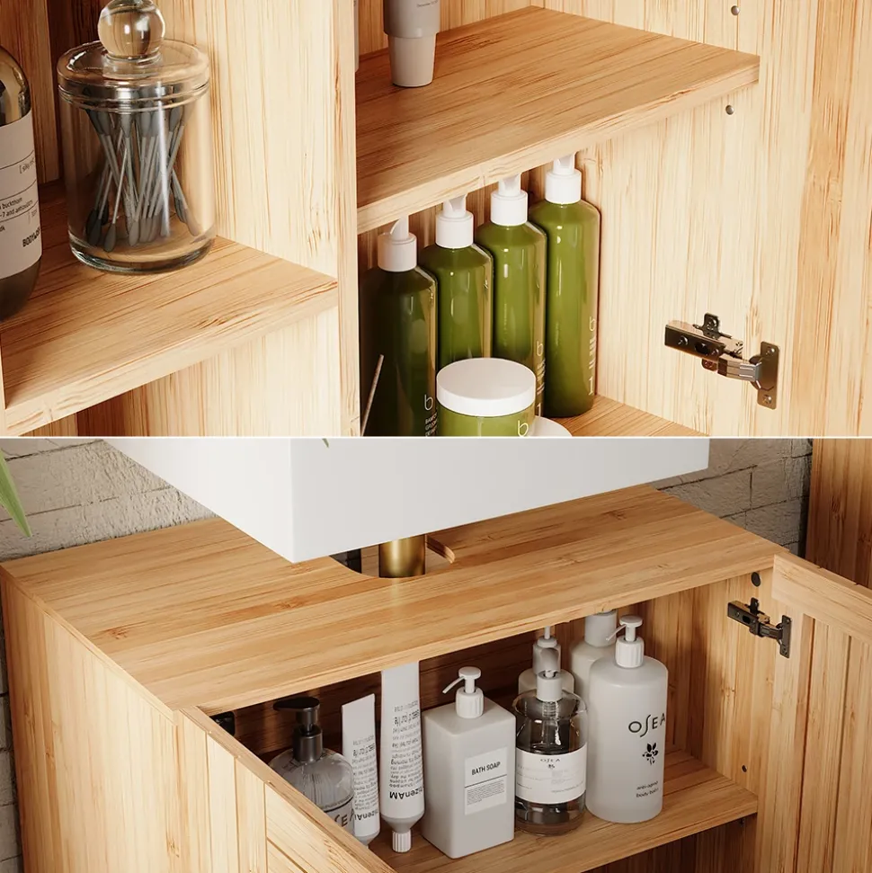 Der Hochschrank Lucie vereint modernes Design mit natürlicher Eleganz. Der Schrank bietet viel Stauraum auf mehreren Ebenen und überzeugt durch seine stabile Bambusstruktur und weiße Elemente, die perfekt in Badezimmer, Küche oder Wohnräume passen.
