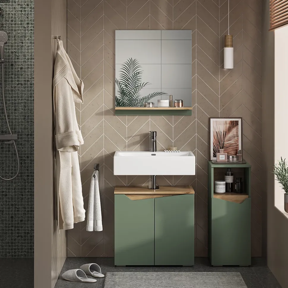 - Die Badmöbel-Kombination bietet optimierten Stauraum. Der Waschtischunterschrank und der Badspiegel vereinen Funktionalität und Eleganz in Ihrem Badezimmer.