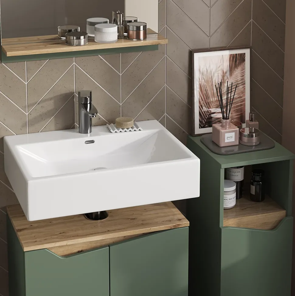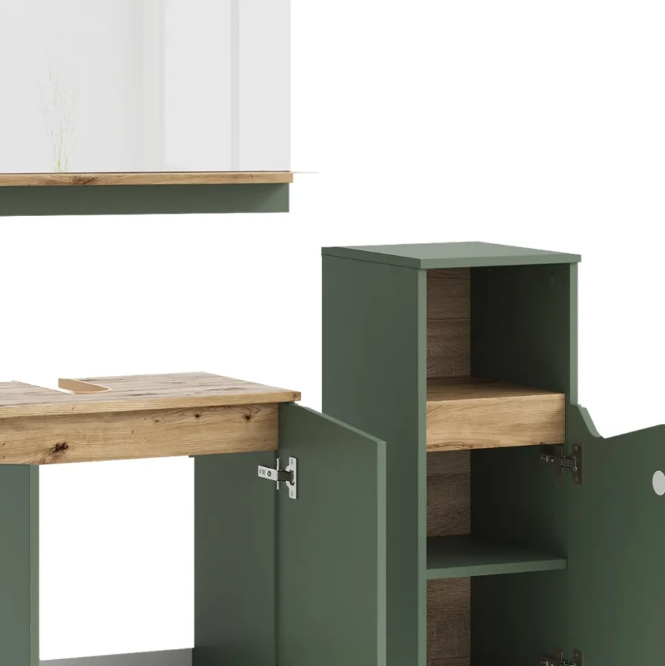 Vervollständigen Sie Ihr Badezimmer mit unserem exklusiven Badmöbel-Set, das Eleganz und Funktionalität in einem bietet. Unser zeitgemäßes Design verleiht Ihrem Badezimmer eine stilvolle Note, die sich nahtlos in Ihre Einrichtung einfügt. Die Oberfläche ist mühelos zu reinigen, sodass Ihr Badezimmer immer strahlend und einladend bleibt. Dank unserer benutzerfreundlichen Anleitung gestaltet sich die Montage unkompliziert, sodass Sie Ihr neues Badmöbel-Set schnell genießen können.
