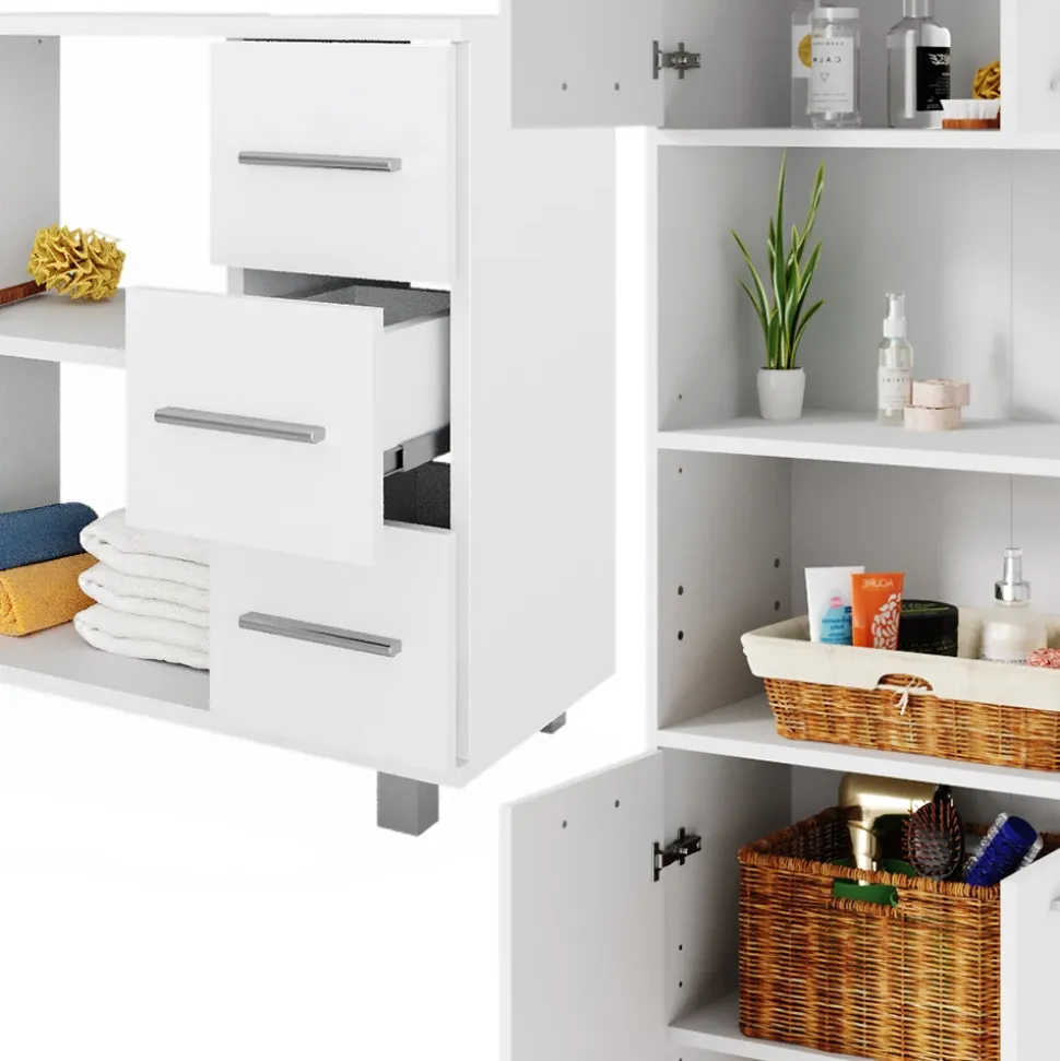 - Das Badezimmerschrank-Set bietet individuell höhenverstellbare Einlegeböden, eine Kombination aus offenen und geschlossenen Regalfächern sowie ausreichend Stauraum für alle benötigten Utensilien.