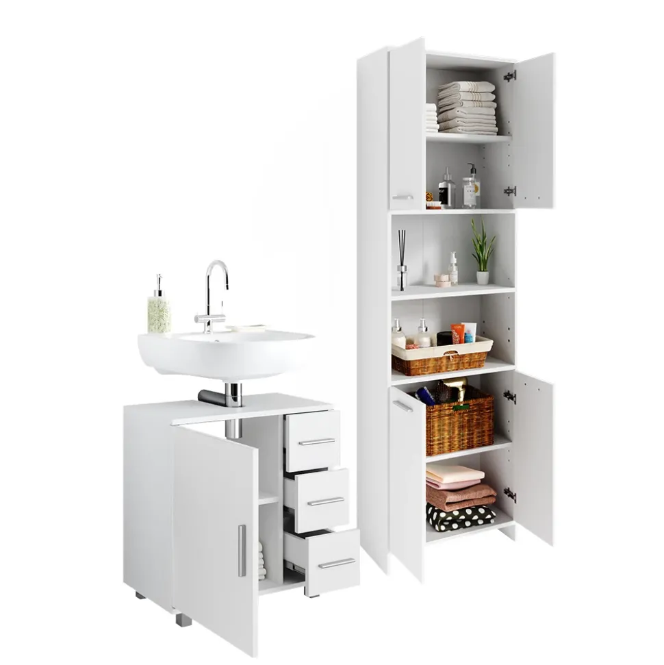 - LIEFERUMFANG: Waschbeckenunterschrank, Hochschrank, Montageanleitung, Montagematerial.